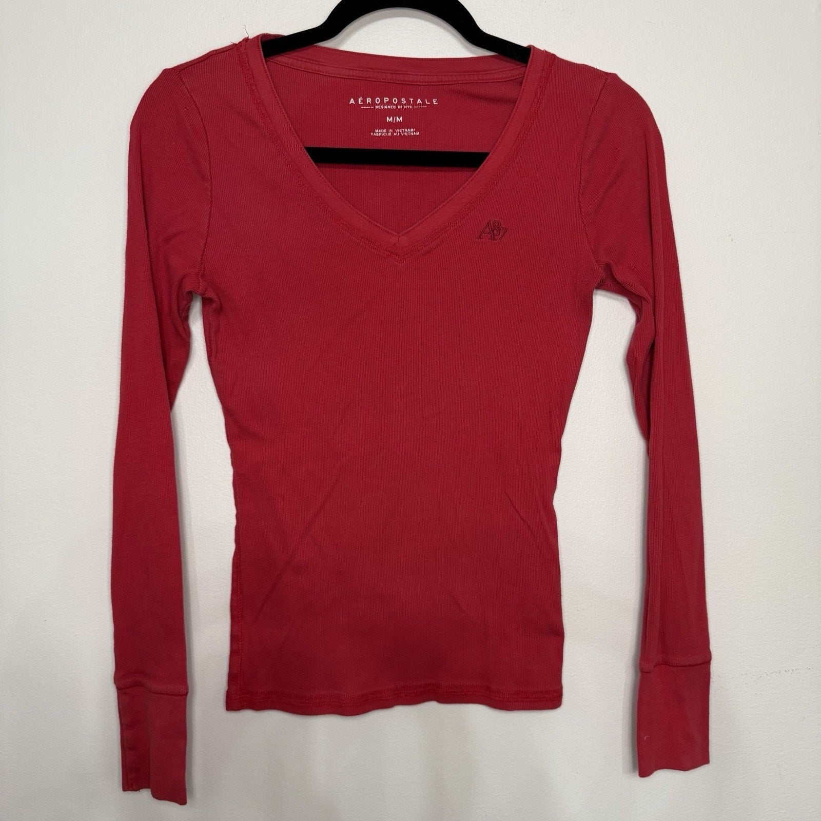 Aeropostale red ribbed long sleeve V-neck top with embroidered chest logo, women’s size Medium.