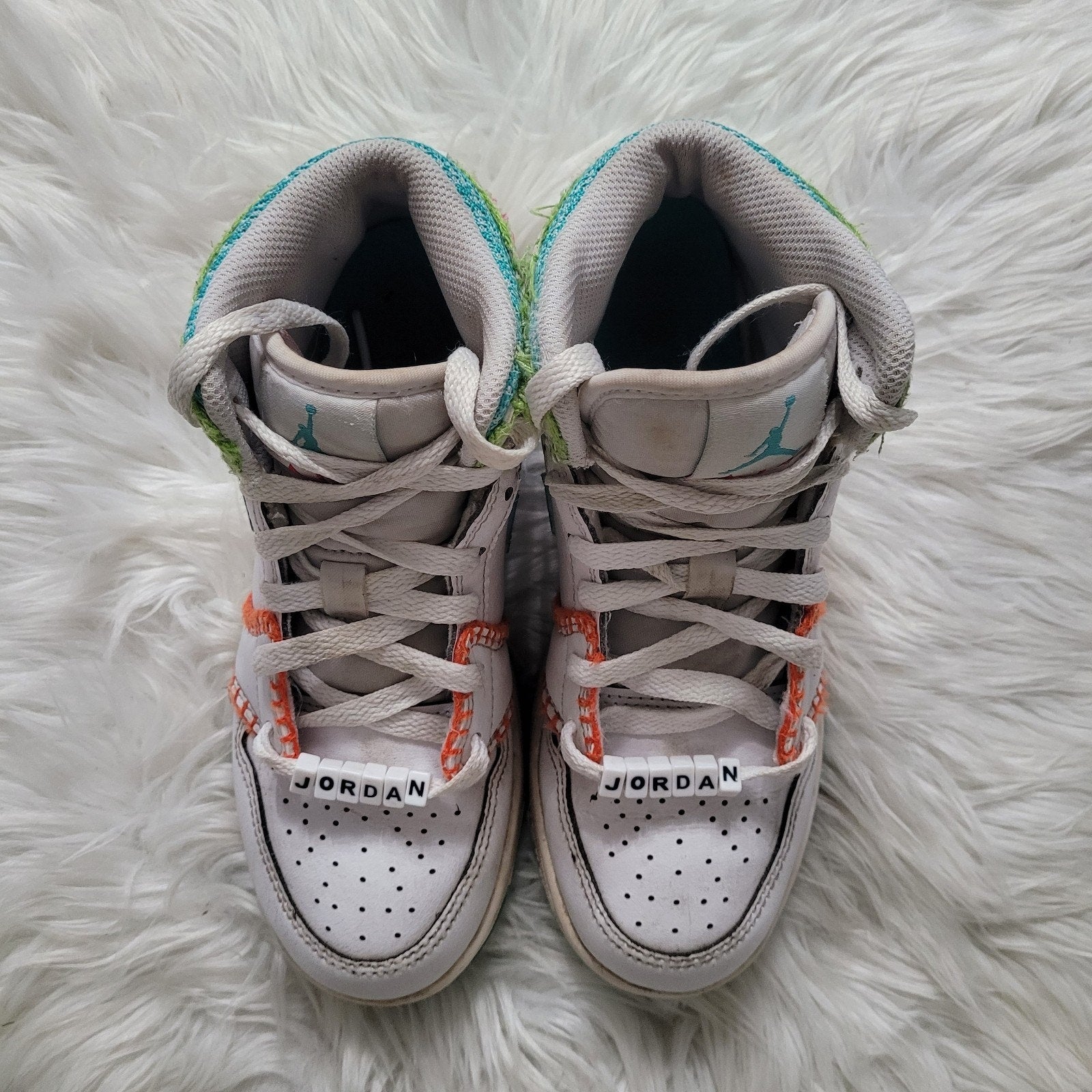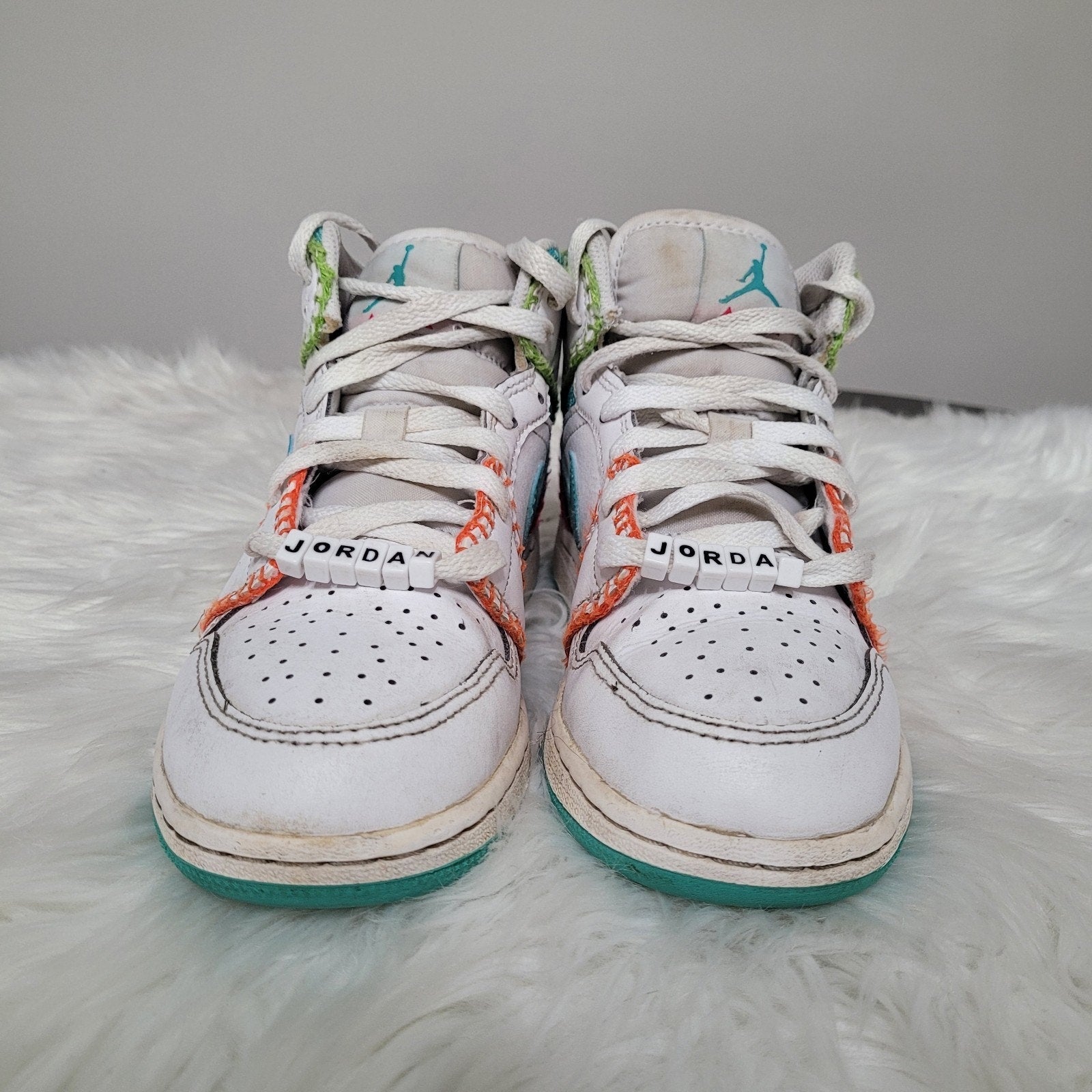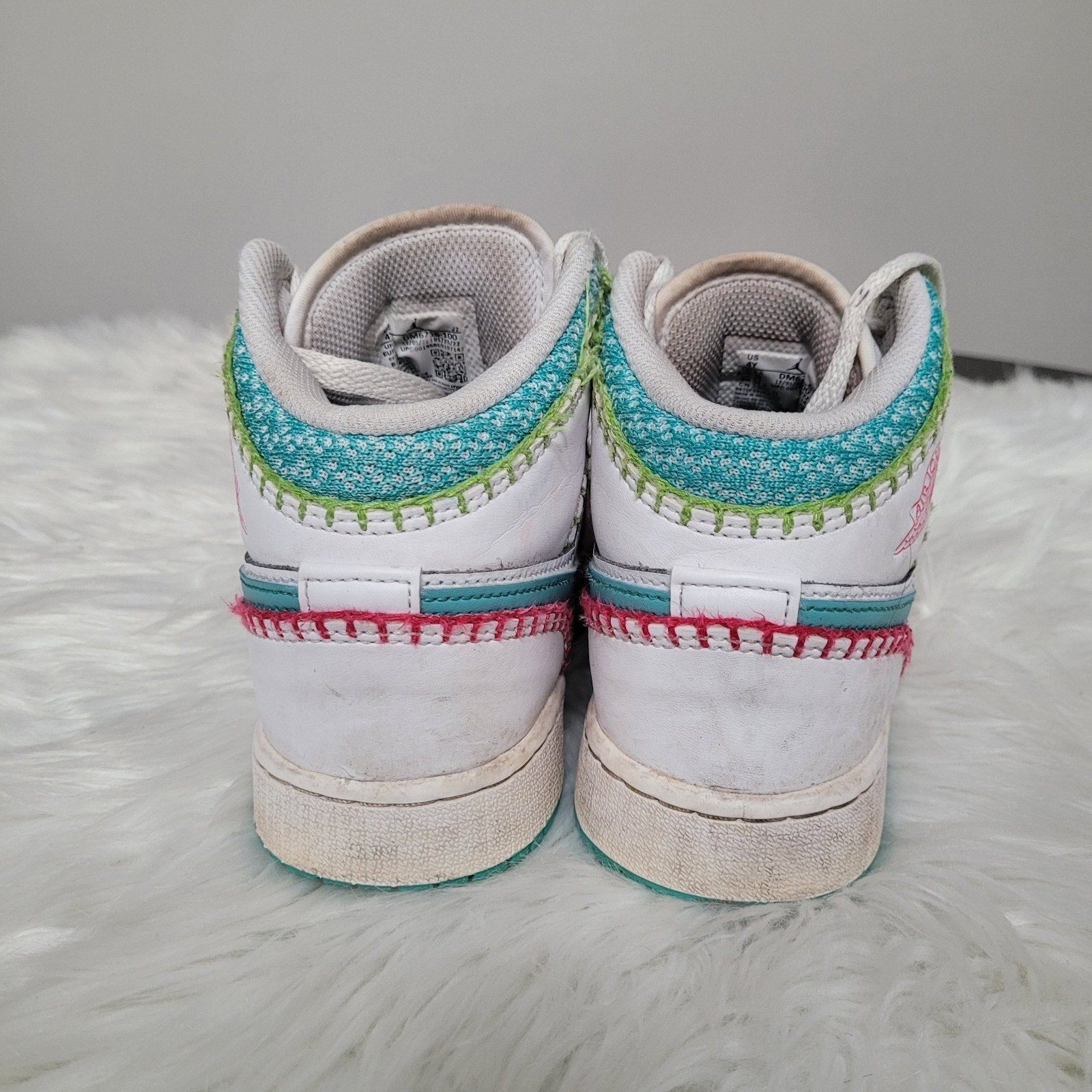 Nike Air Jordan 1 Mid SE Stitch sneakers, youth size 4Y, white with multicolor stitch accents.