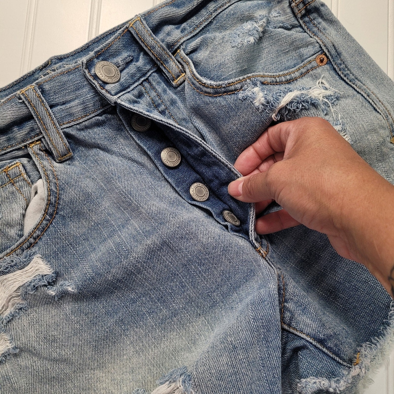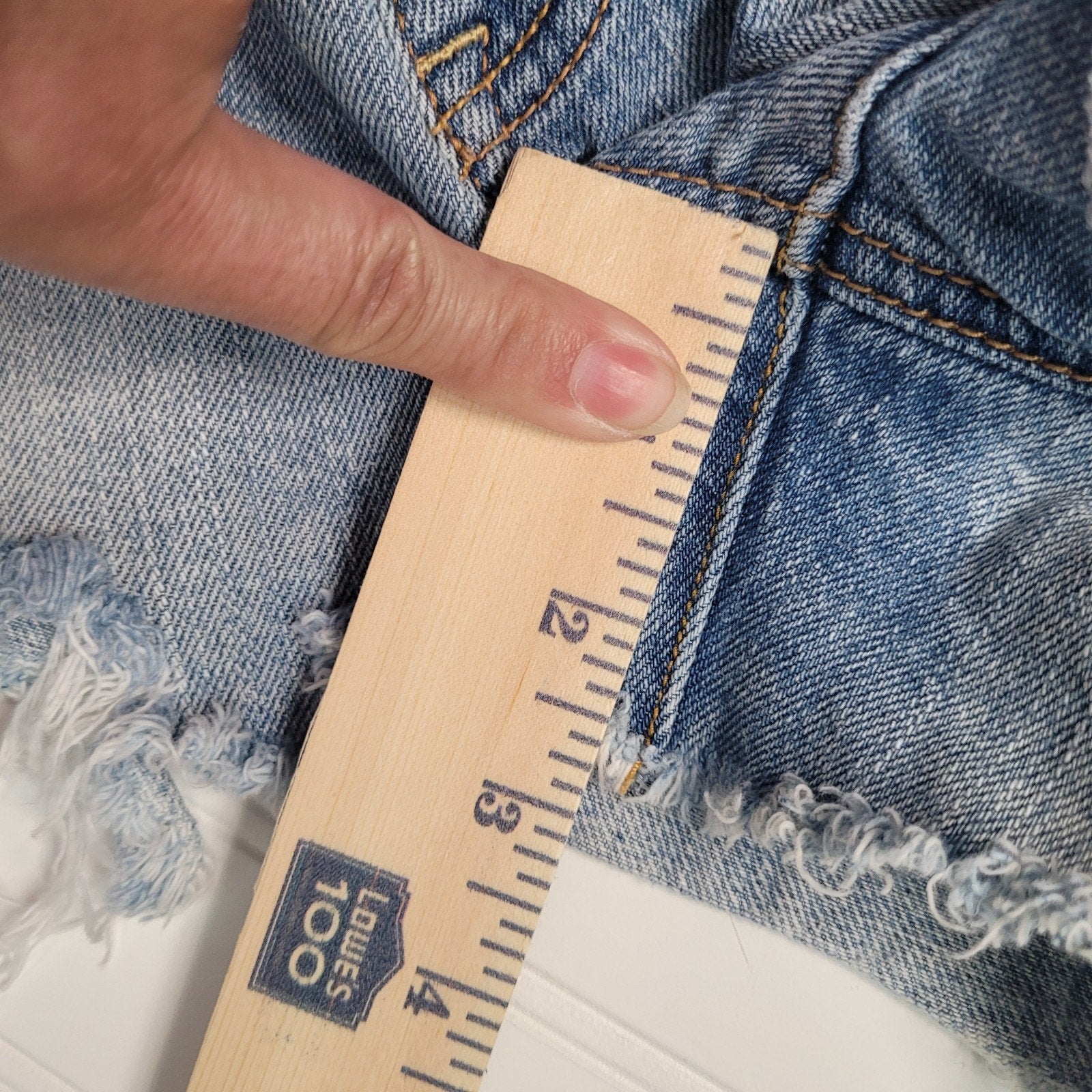 Soft cotton denim with a touch of stretch for comfort. Low rise Shortie cut with raw frayed hems. Distressed detailing and fading for vintage Y2K appeal. Classic 5-pocket styling with button fly closure. VGUC normal wear, minimal fade consistent with wash.