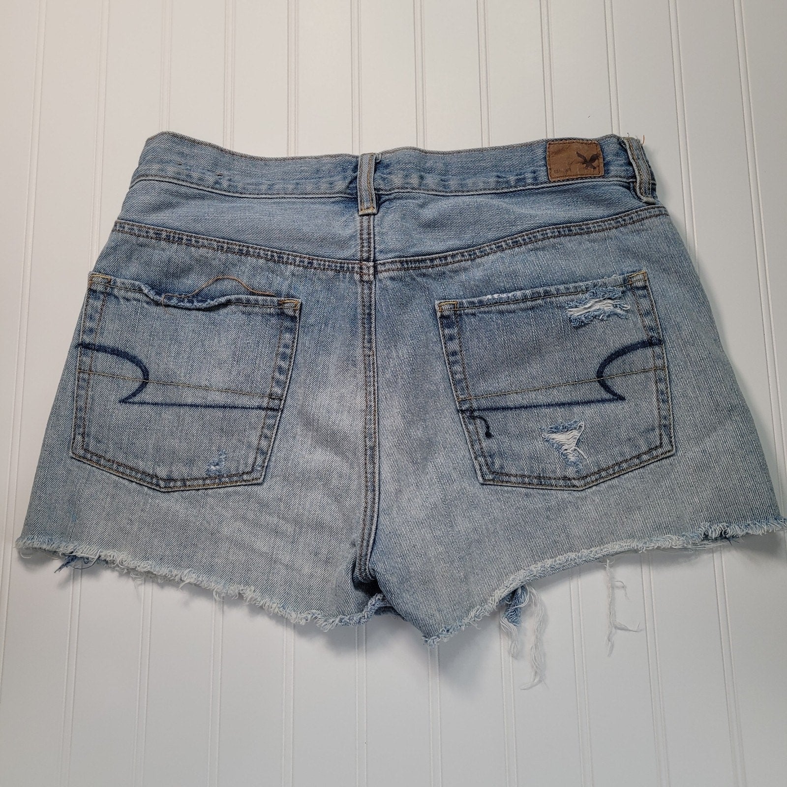 American Eagle Shortie denim shorts in light wash, women’s size 6, low rise fit with button fly and 3" inseam.