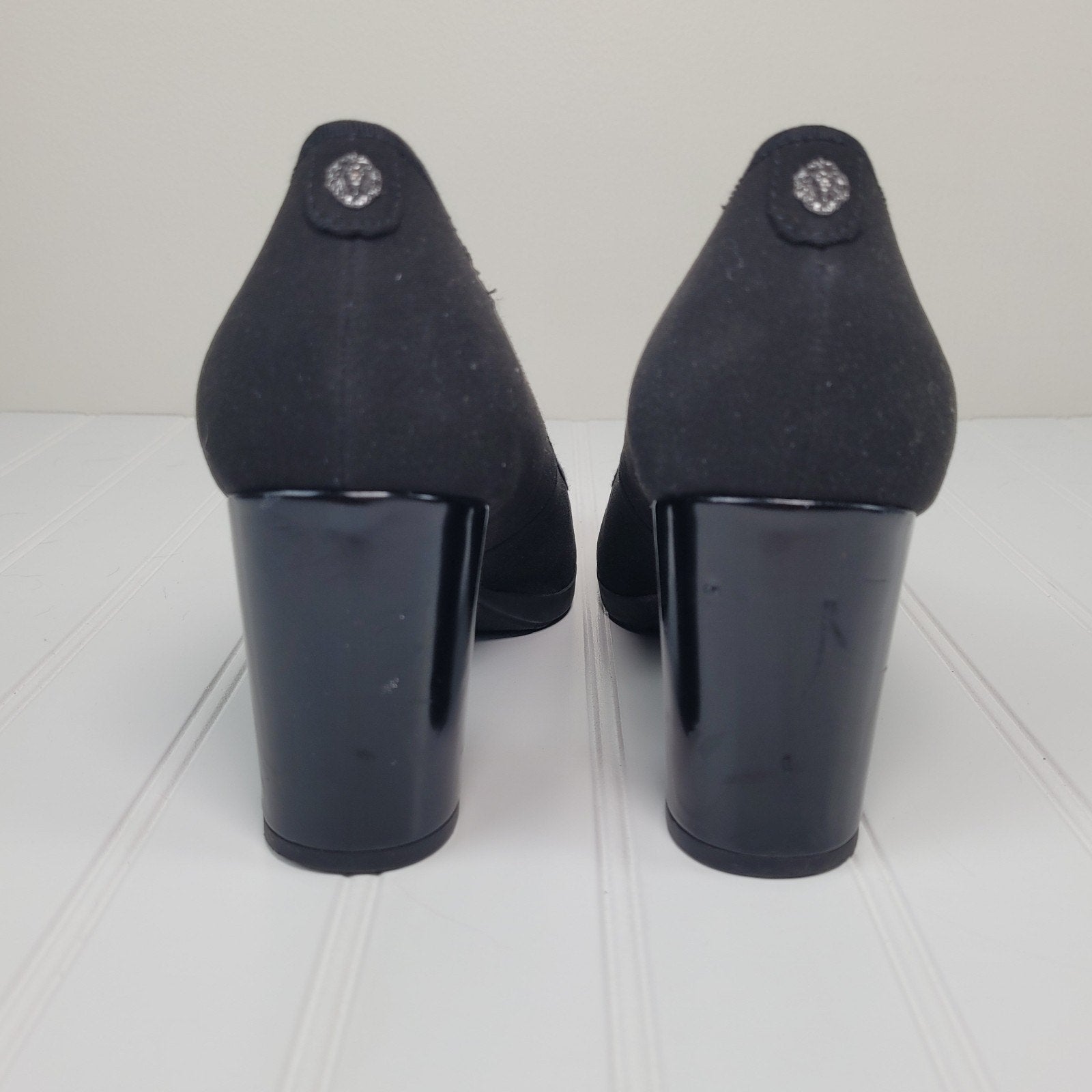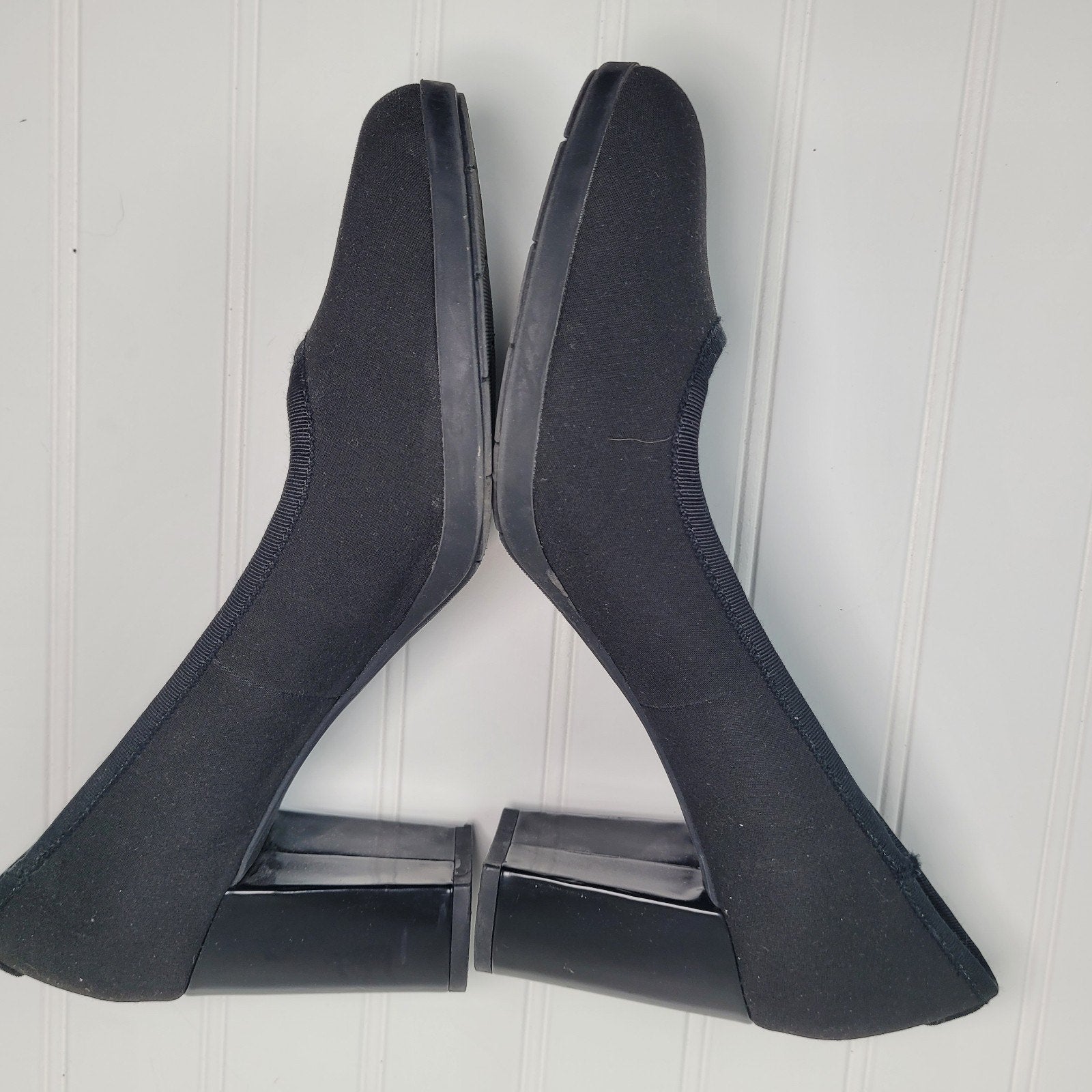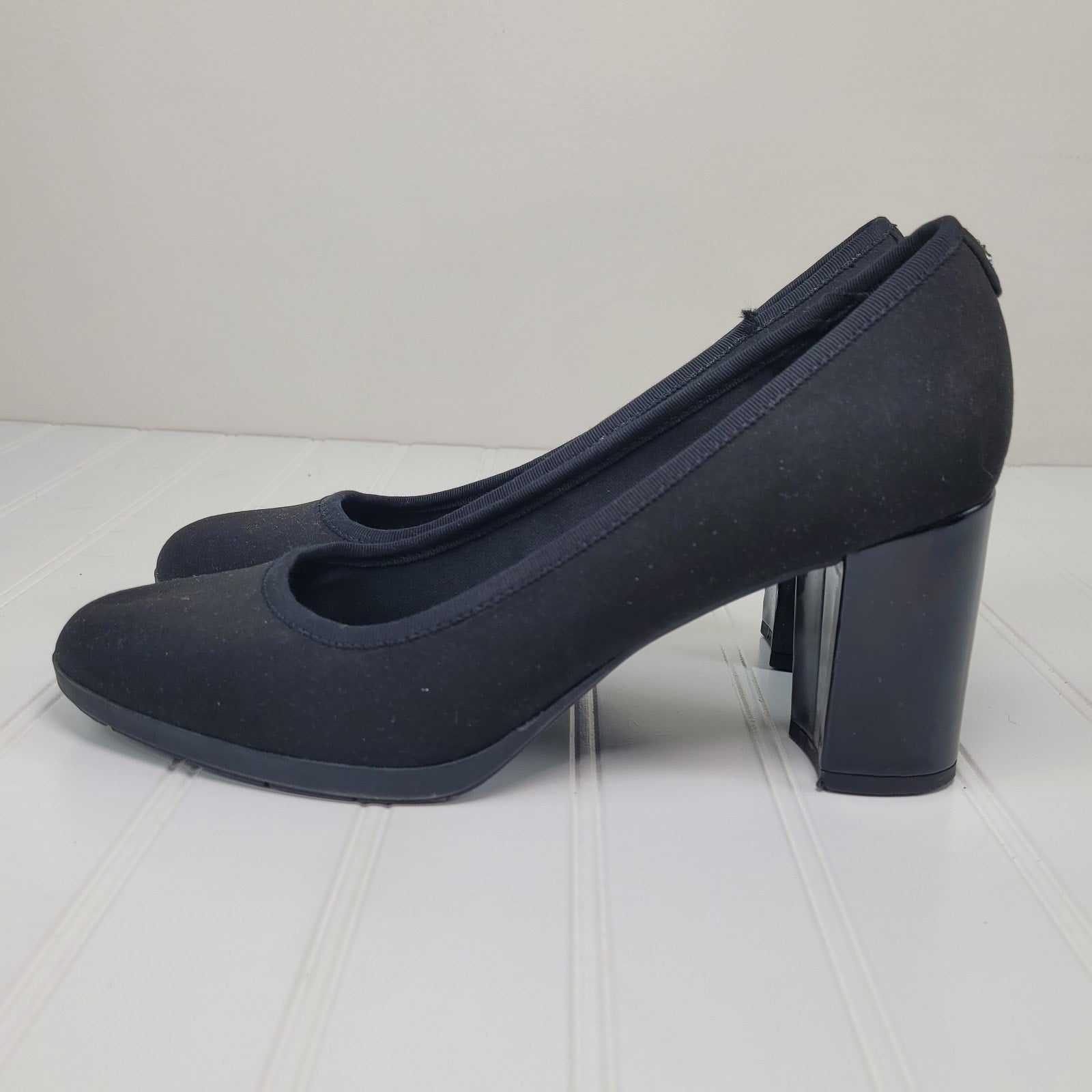 Anne Klein “Carole” pumps in black fabric, women’s size 8.5, featuring round toe and sleek block heel great addition to any capsule wardrobe.