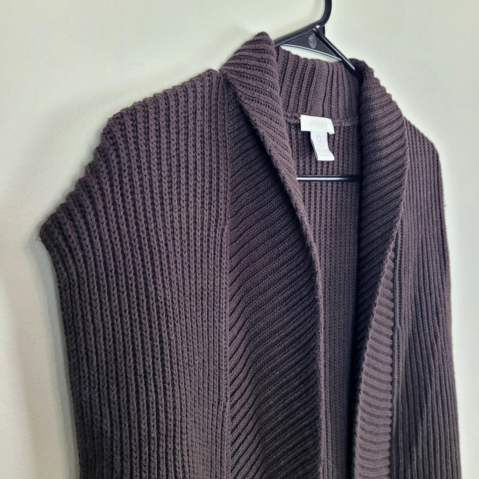 Chico’s sleeveless open-front cardigan in rich chocolate brown, size 0 (fits like Small), crafted from a luxe cashmere blend knit.