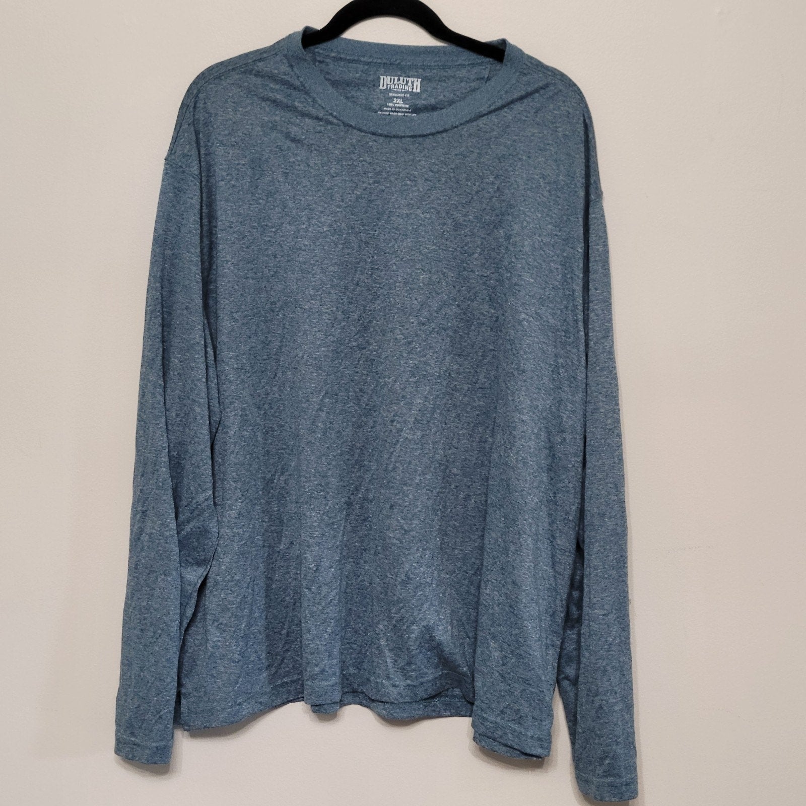 Duluth Trading performance long sleeve shirt in heather blue, size 2XL. This versatile base layer features the brand's signature durable construction and comfortable fit that's perfect for work, outdoor activities, or casual everyday wear.
