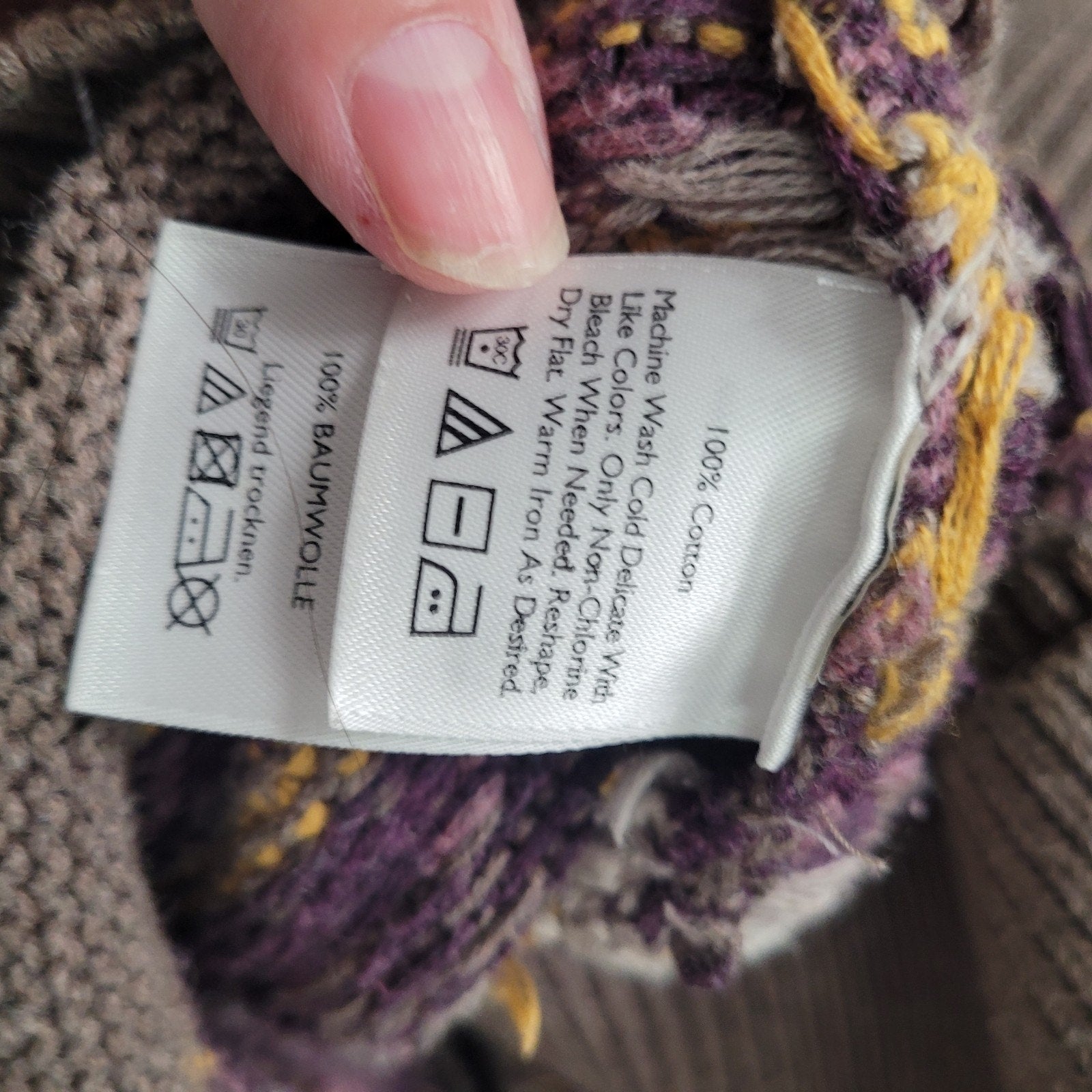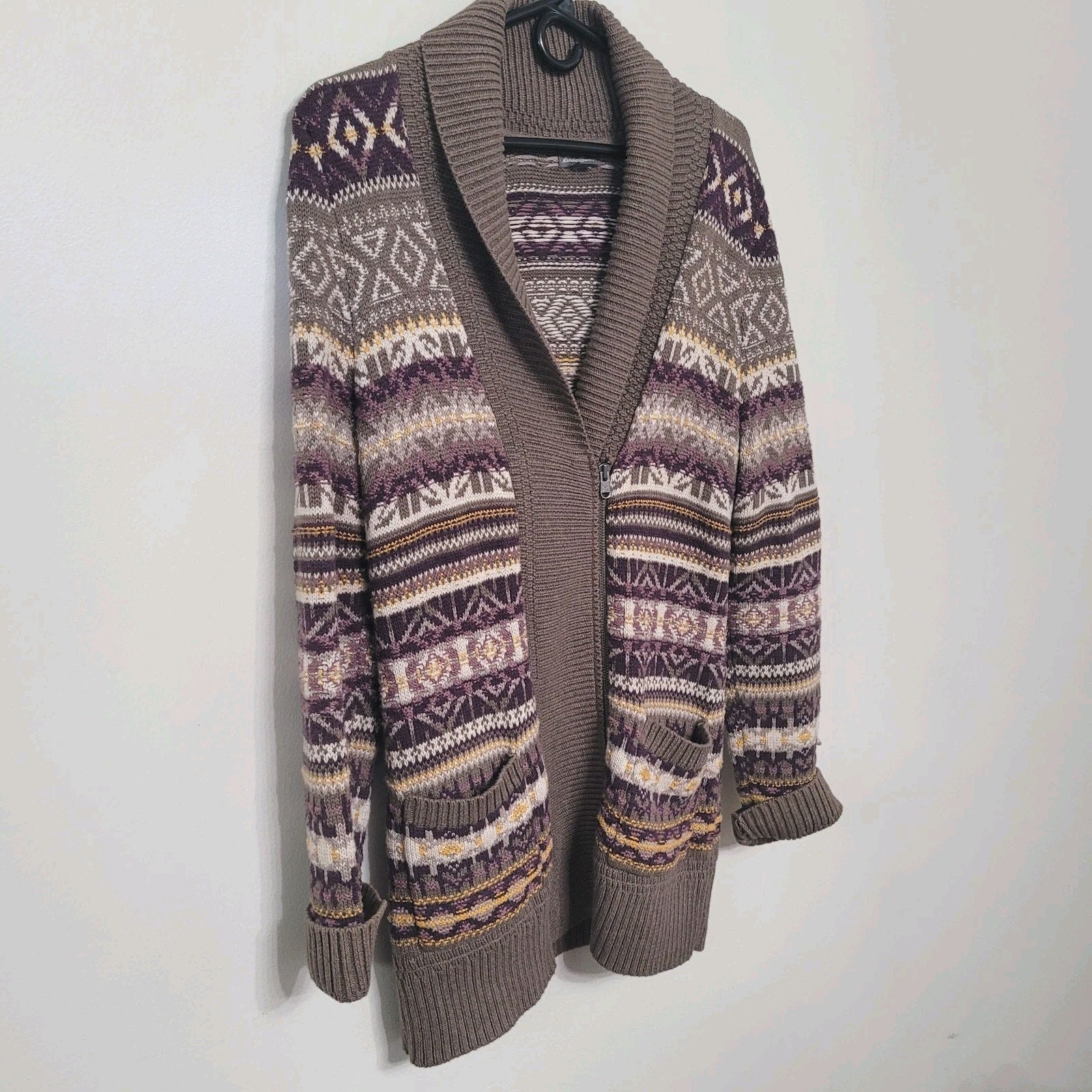 The Eddie Bauer Mid Length Chunky Multicolor Knit Fair Isle Sweater in size small is a stylish and cozy cardigan perfect for the winter and fall seasons. Made from 100% cotton in a chunky-knit style, this sweater features a collared neckline, long sleeves, and pockets for added functionality. The multicolor Fair Isle pattern adds a festive touch, making it ideal for casual occasions. With a regular fit and classic cardigan style, this Eddie Bauer sweater is a versatile and comfortable addition to any woman's wardrobe.