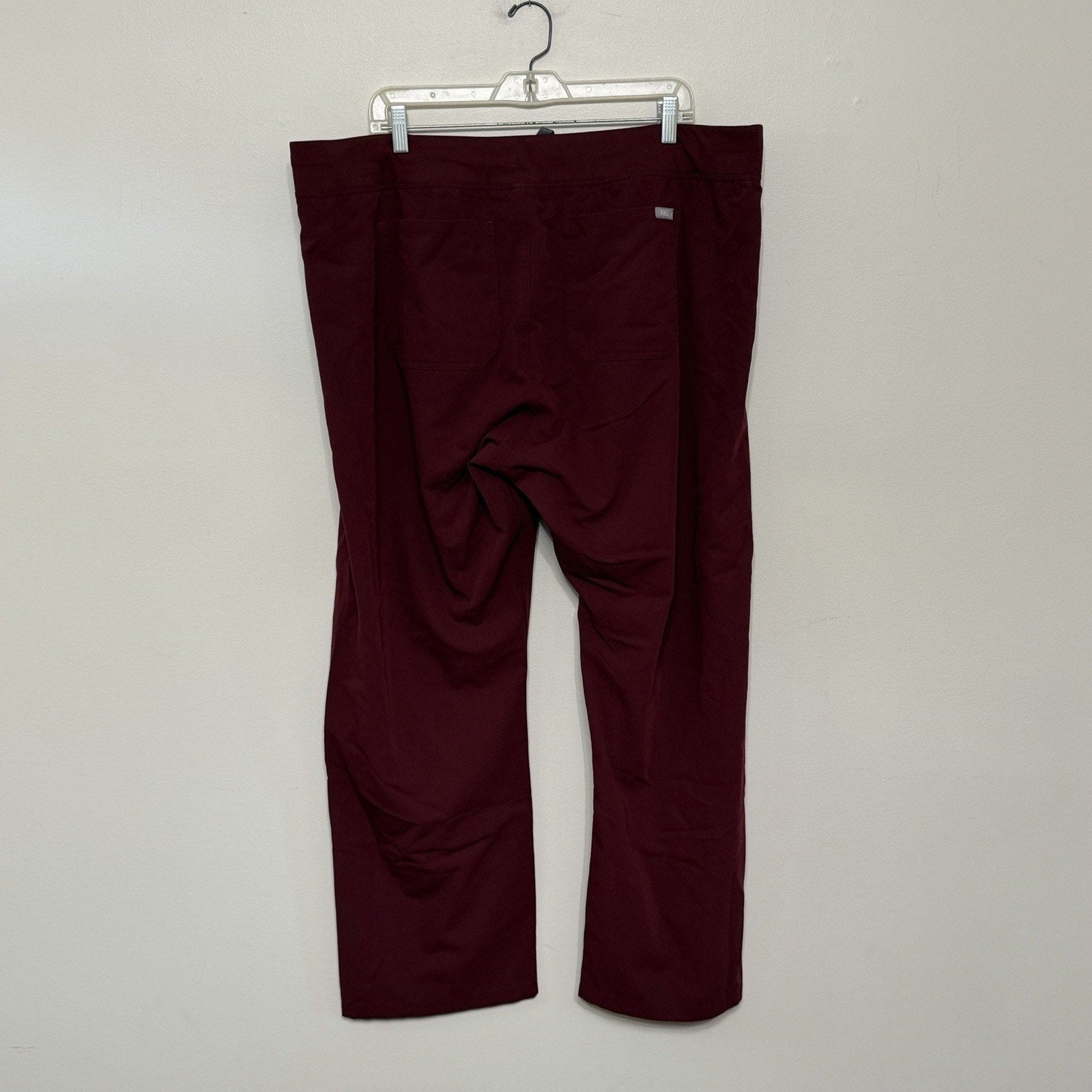 The product is a pair of XXL burgundy FIGS scrub pants designed for women in the medical industry. This solid-colored bottom features a polyester material that is both comfortable and durable for long shifts in a medical setting. With a focus on functionality and style, these nursing scrub pants are a practical choice for those in need of reliable and high-quality work clothing.