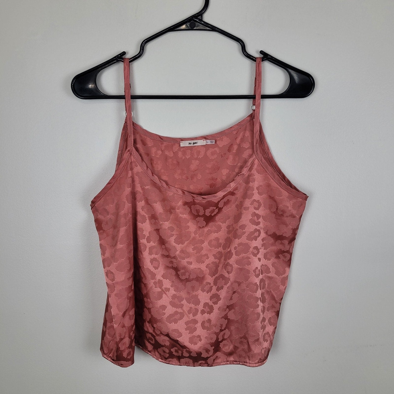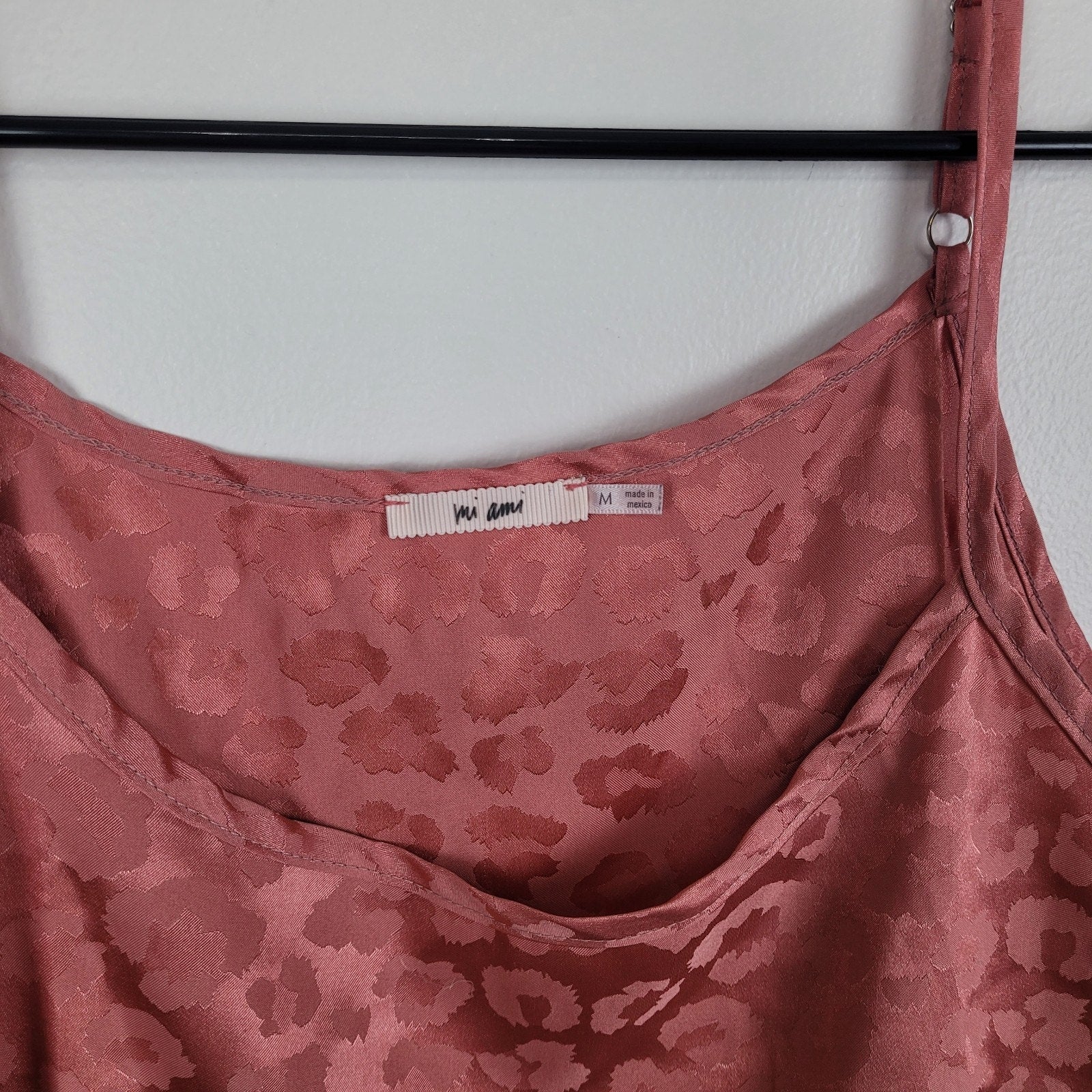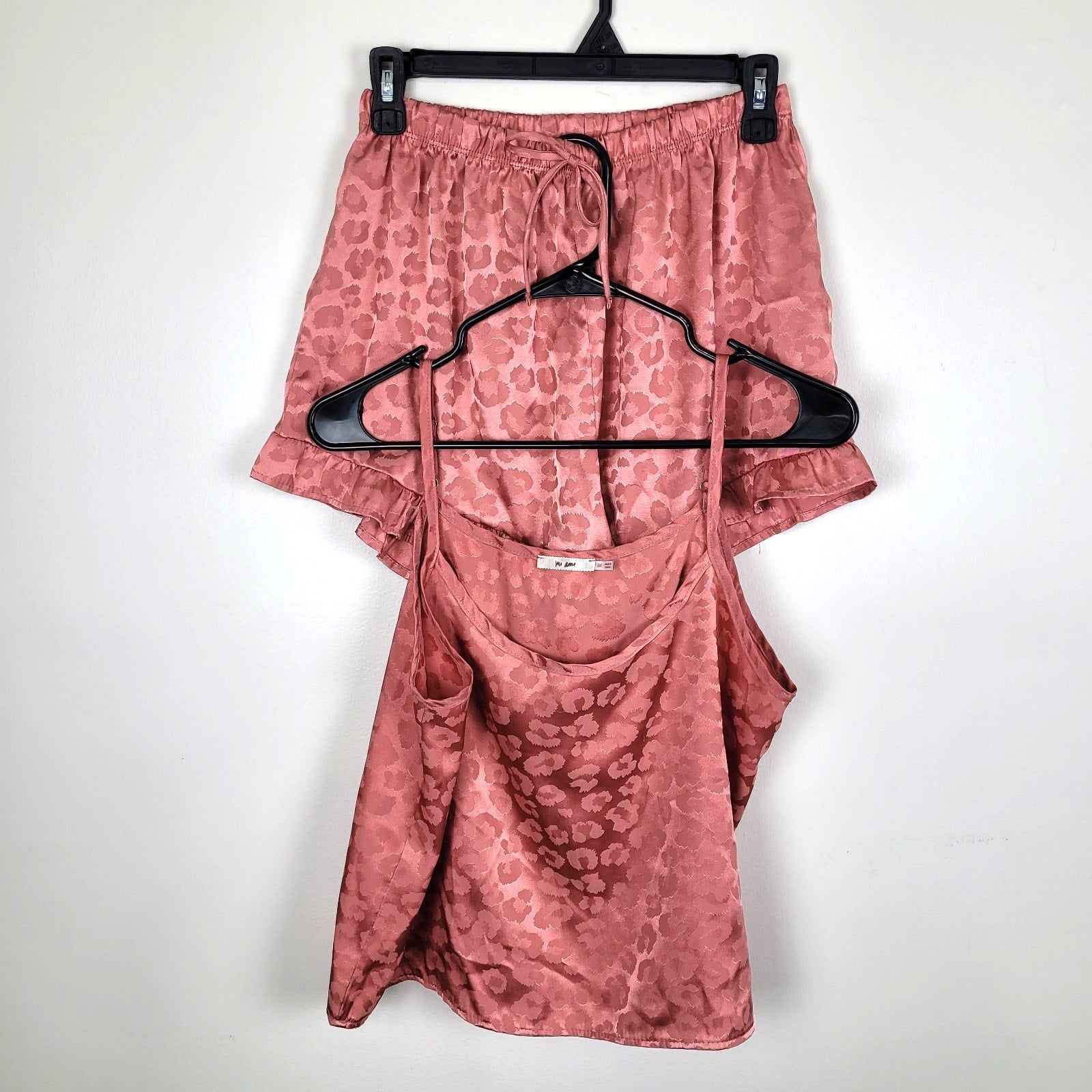 Francesca’s two-piece sleep set in pink satin leopard print, women’s size Medium, includes cami top and matching ruffle shorts.