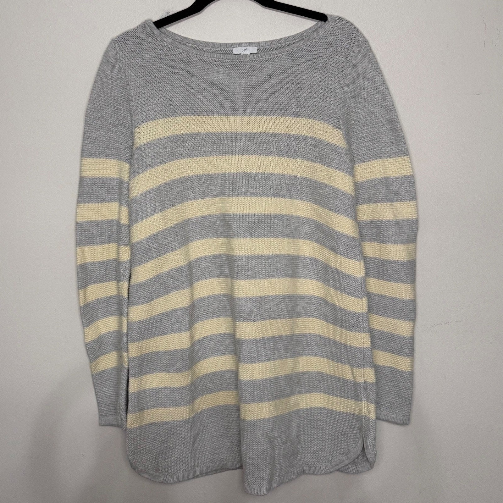 J.Jill lightweight knit pullover sweater in soft gray with pale yellow stripes, women’s size Medium