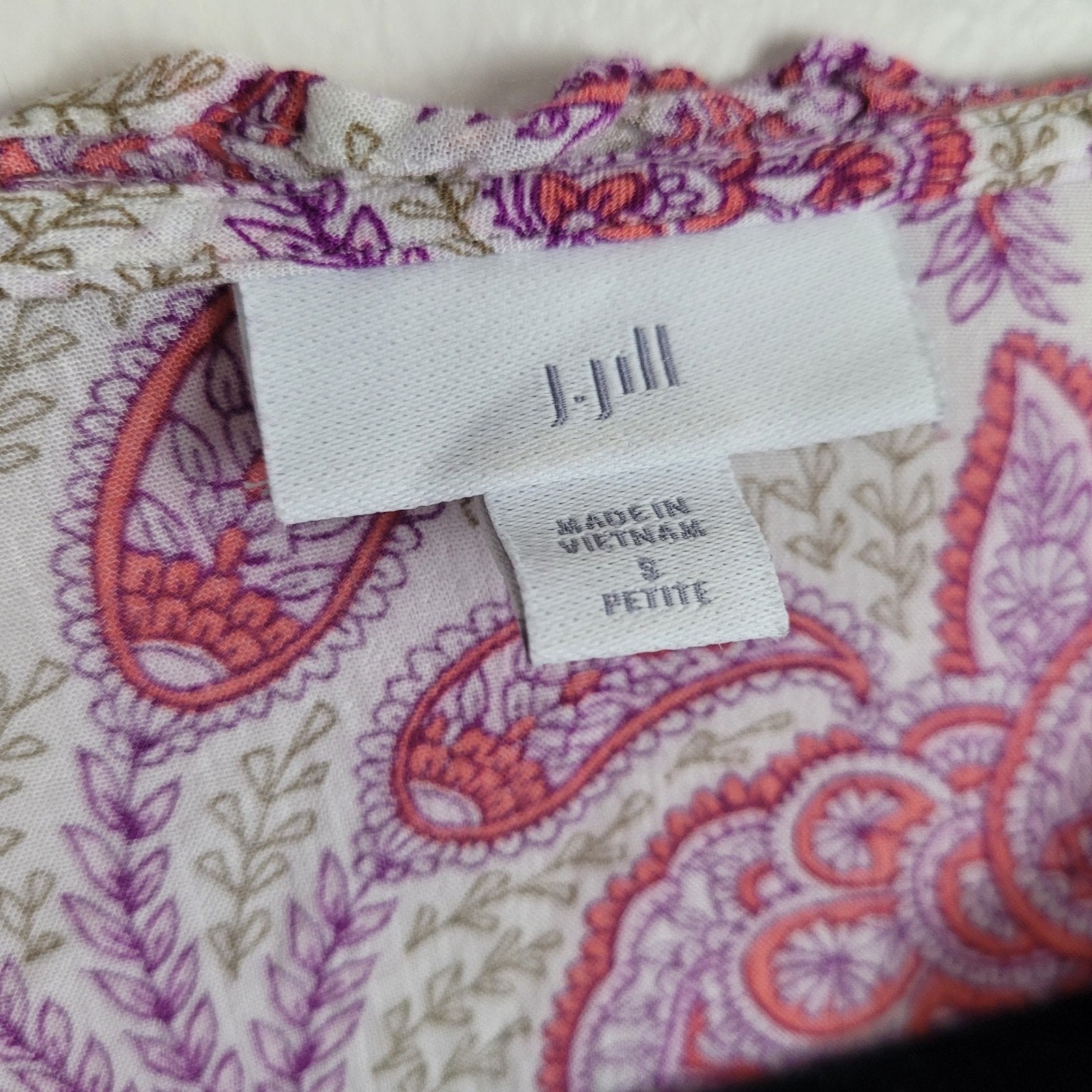 J.Jill women’s size small petite blouse in pink paisley print with ruffle short sleeves