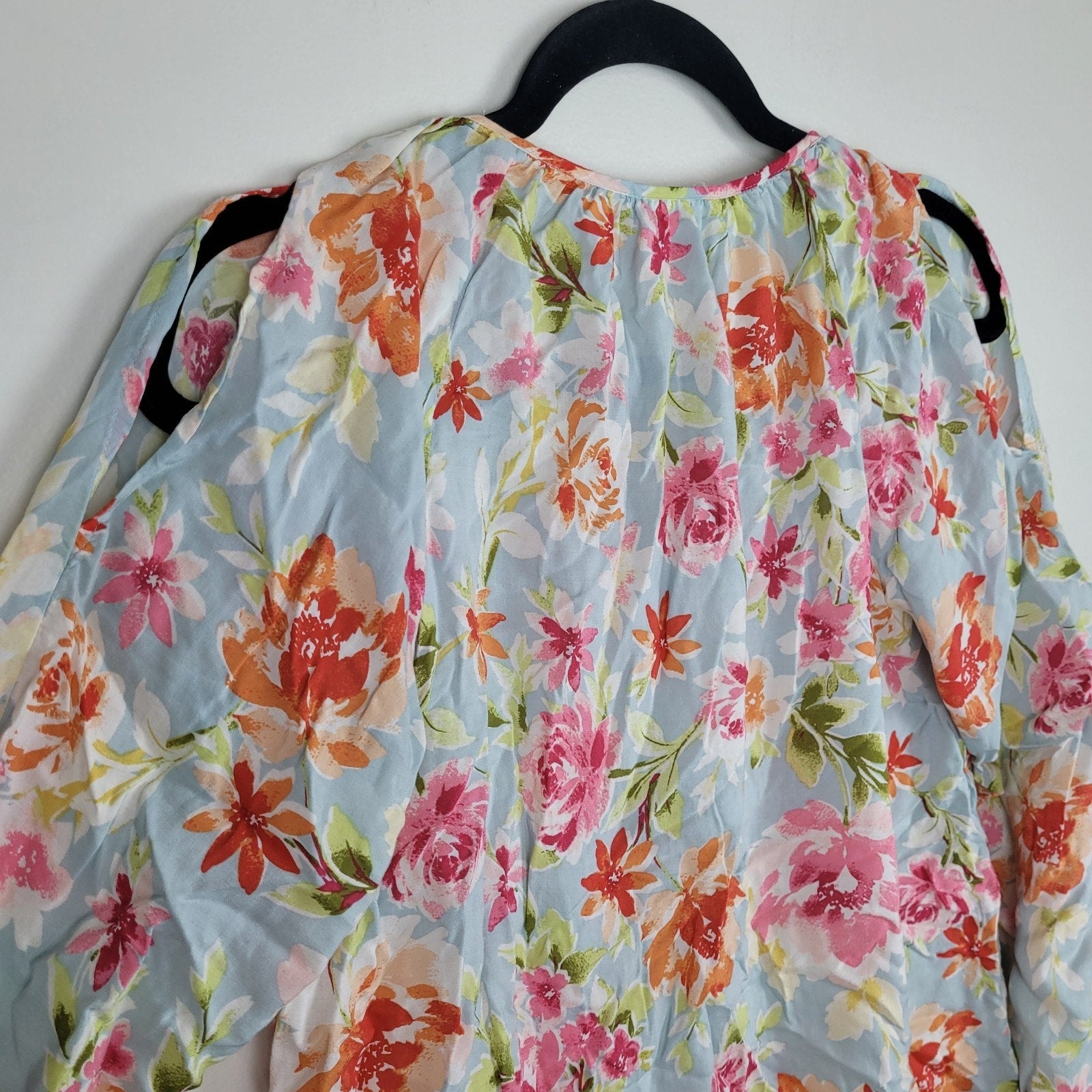 J.Jill Womens S Petite Floral Blouse Multicolor Round Neck Cold Shoulder LS