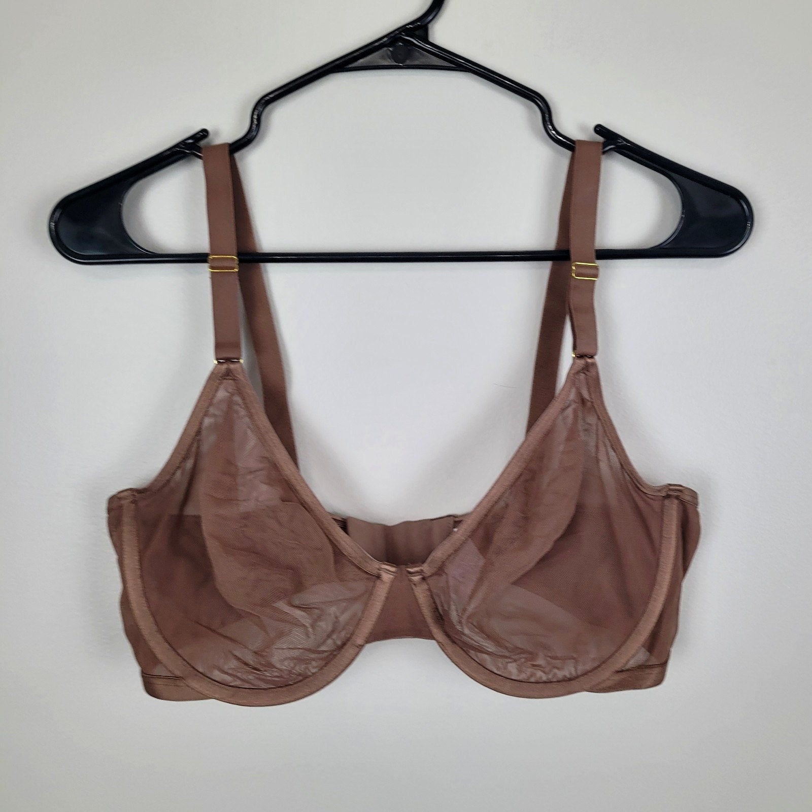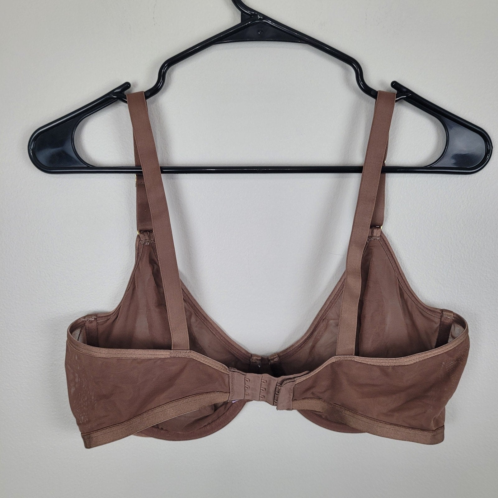 Joyspun sheer mesh unlined underwire bra in rich chocolate brown, women’s size 42C.