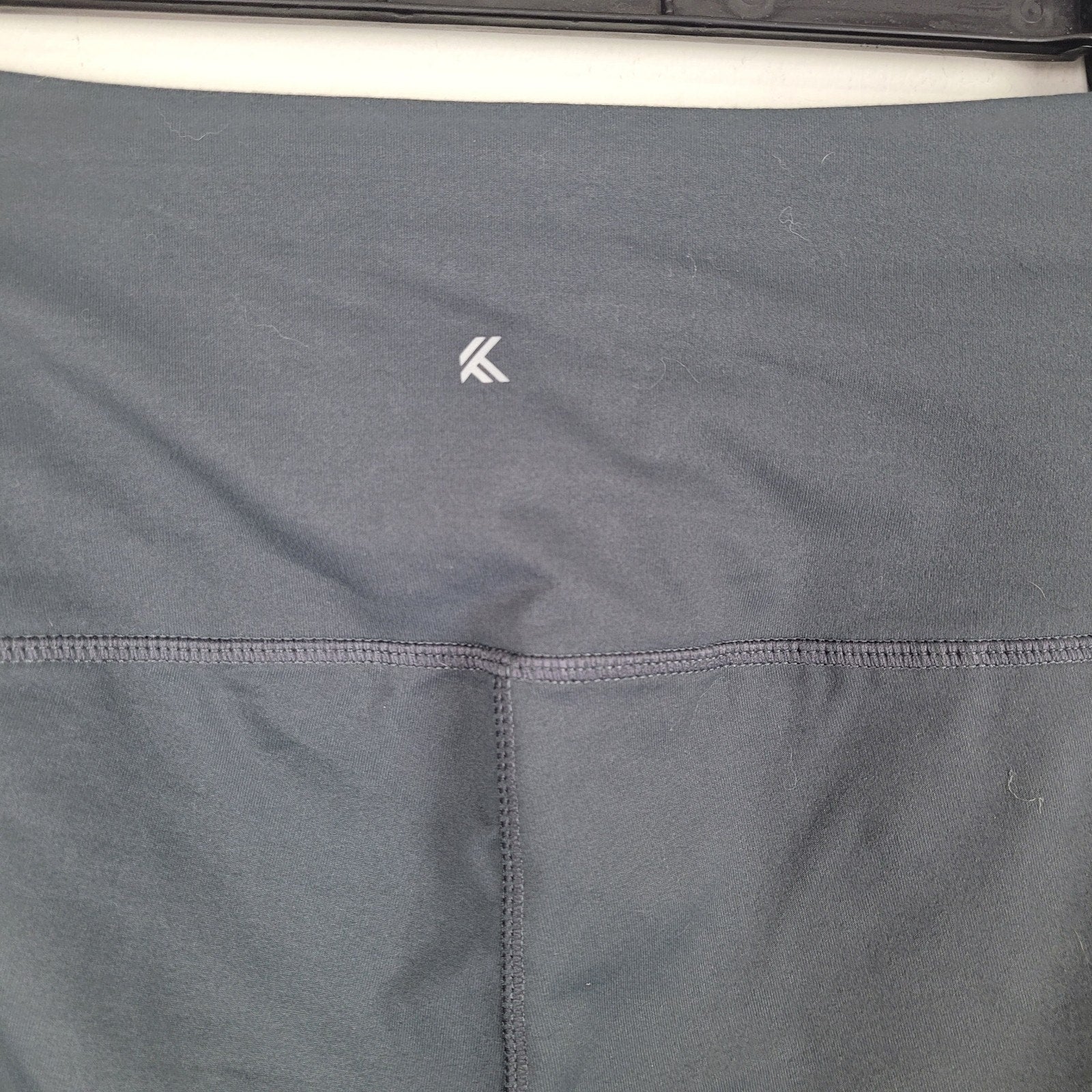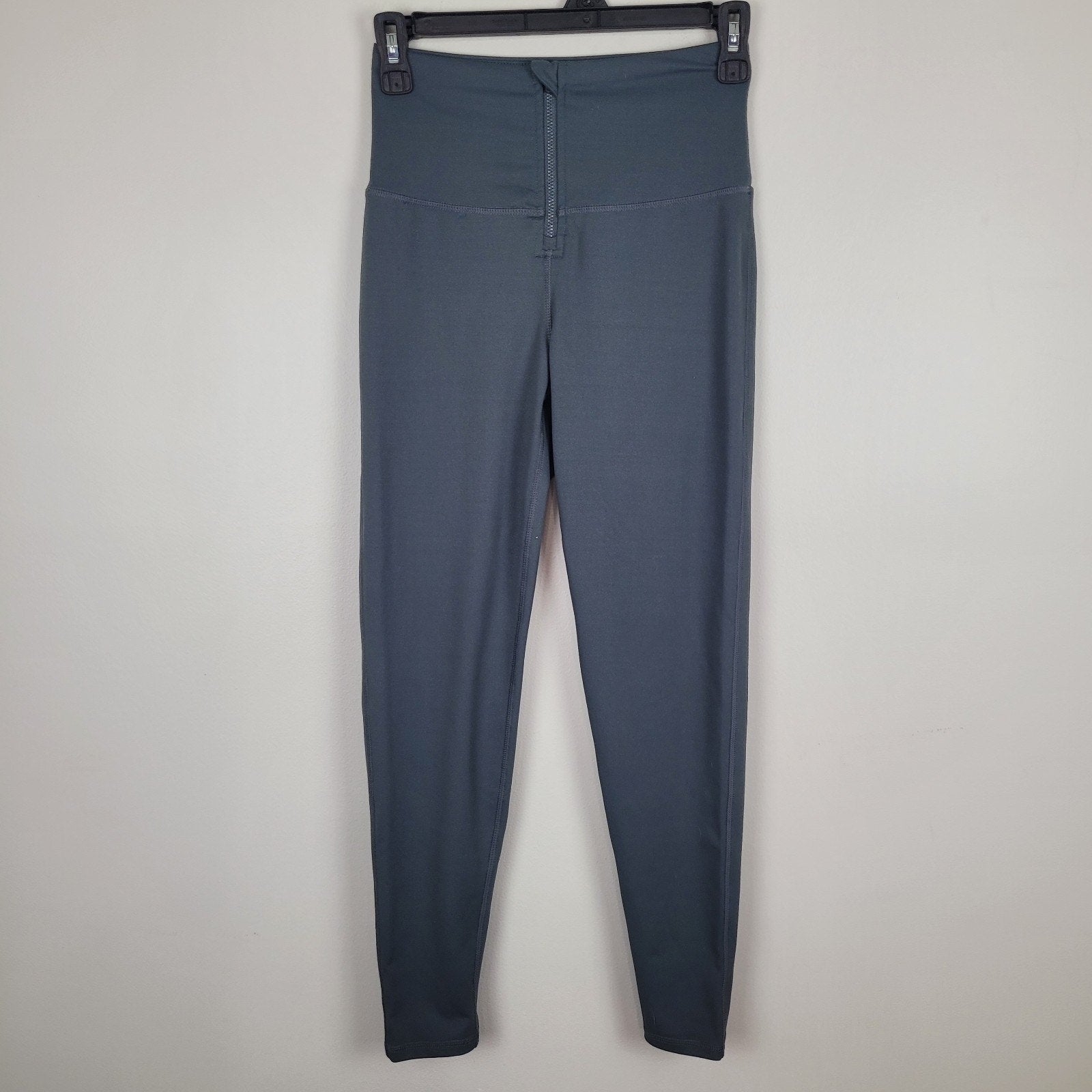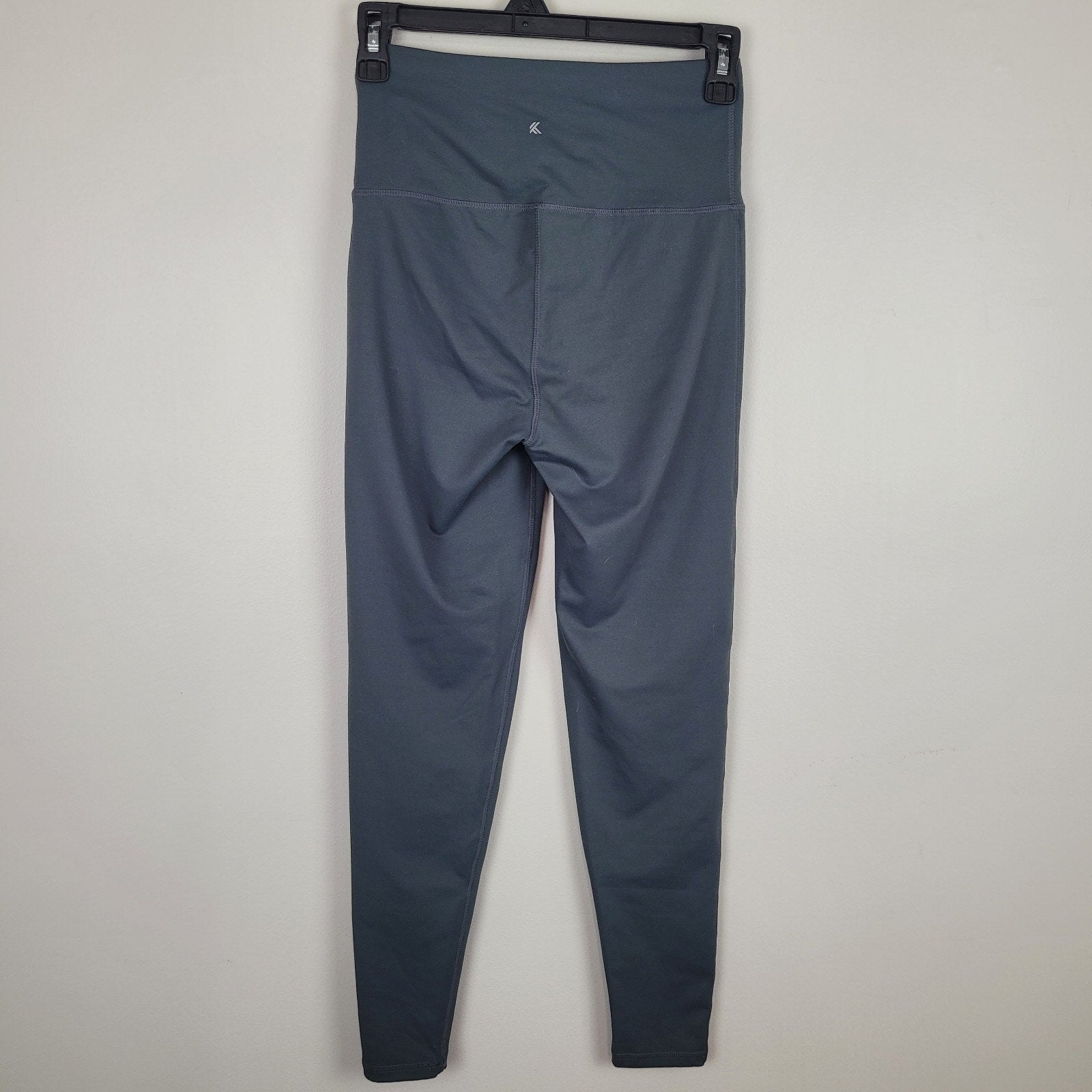 Kyodan high-waisted leggings in gray, women’s size XS with zipper waist pocket and sleek athleisure silhouette.