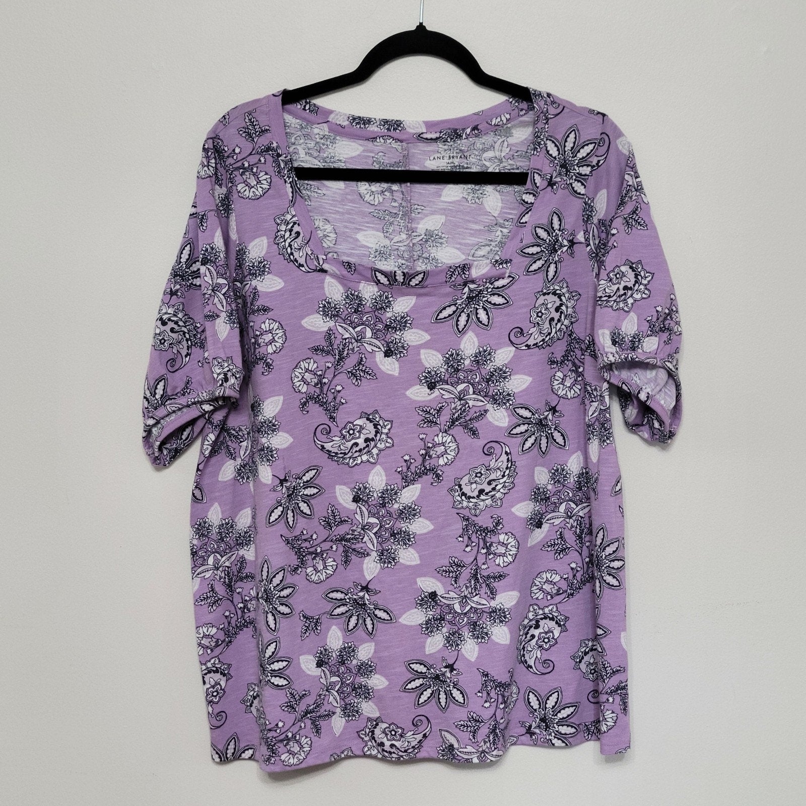 Lane Bryant chiffon blouse in beautiful purple and lilac paisley print, size 26/28. This flowing boho top features kimono-style sleeves and delicate chiffon fabric that creates an elegant, feminine silhouette perfect for special occasions.
