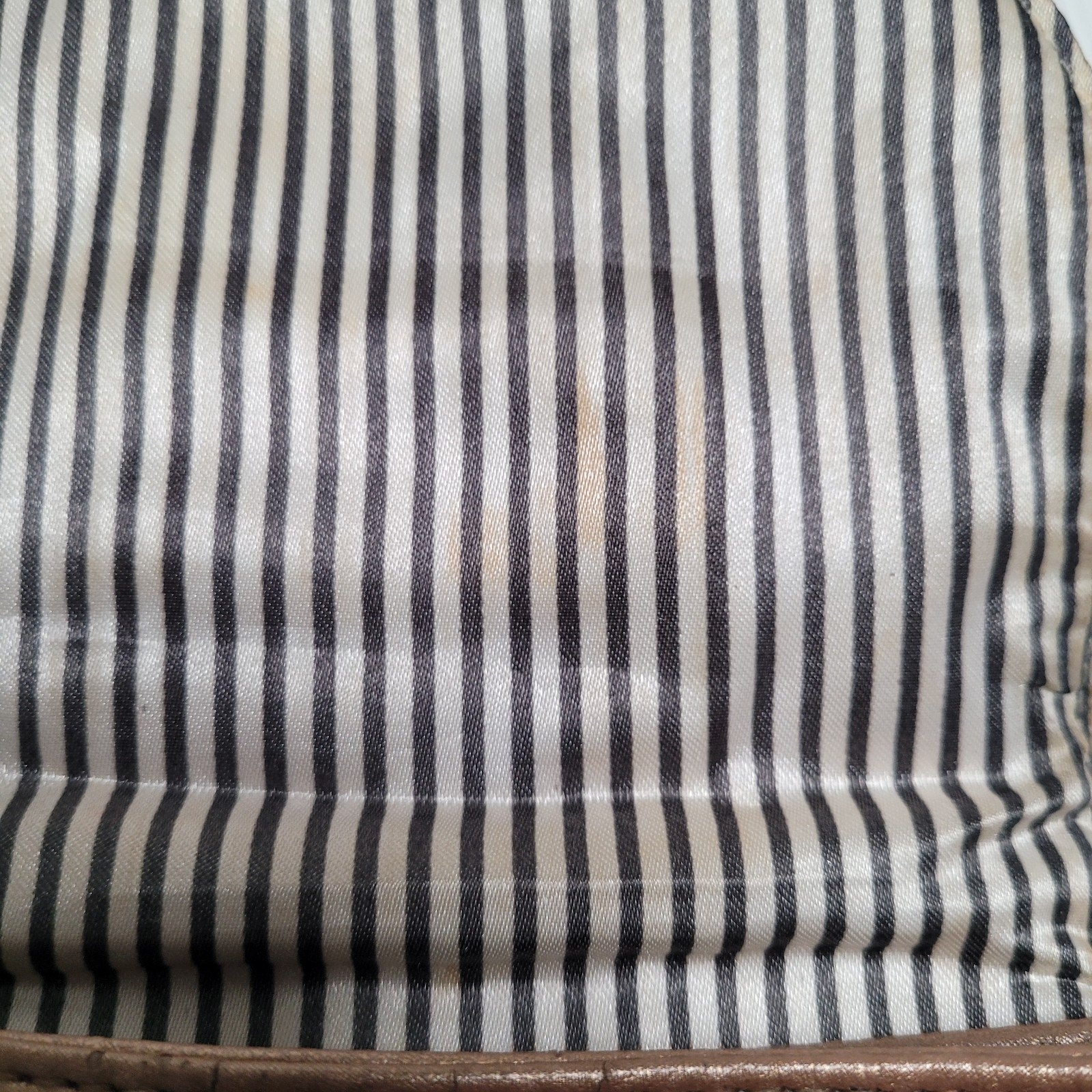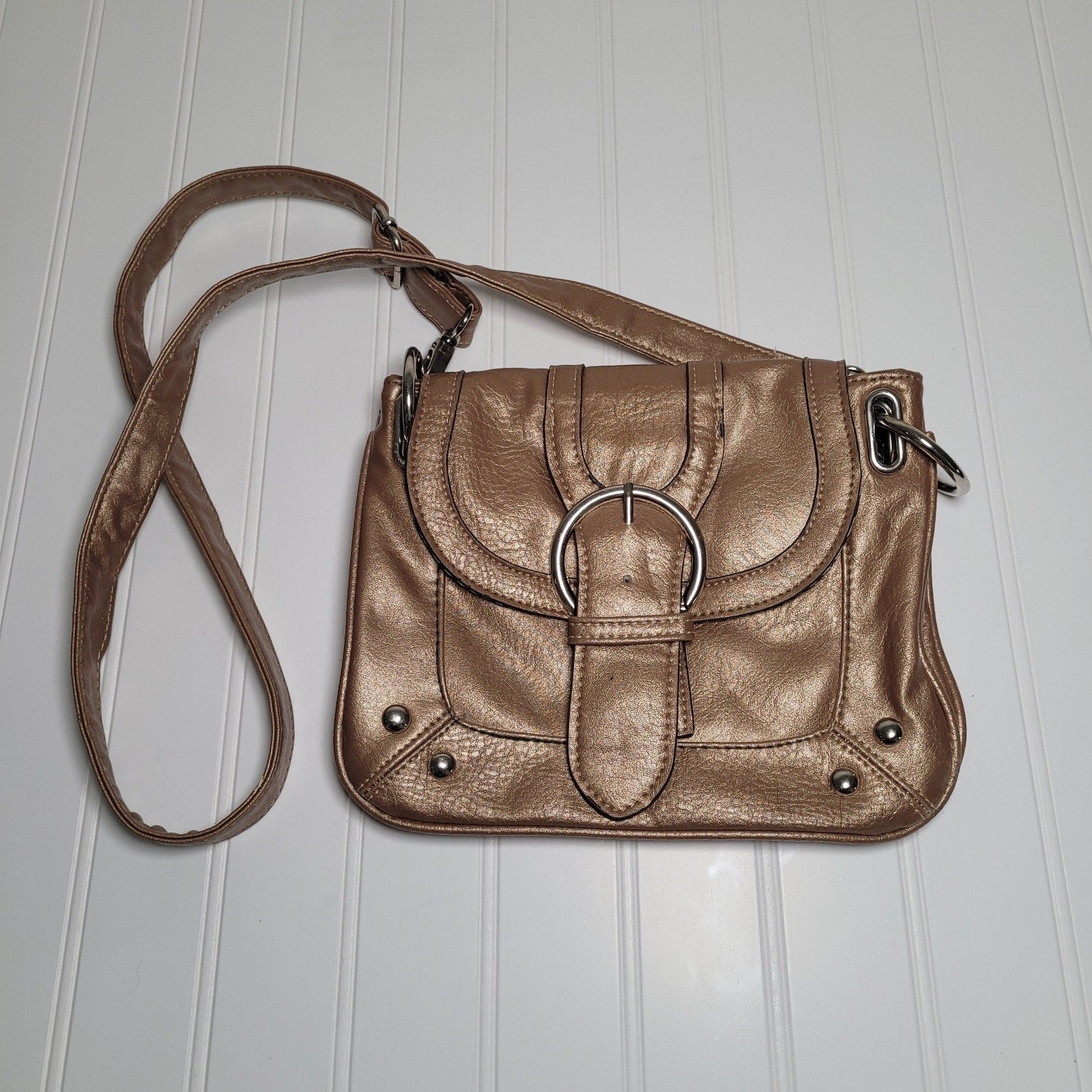 Compact Y2K-inspired mini bag with western-style hardware. Adjustable crossbody strap and magnetic buckle flap closure. Fully lined striped interior with zip and slip pockets. Metallic tan finish gives a chic 2000s boho vibe.