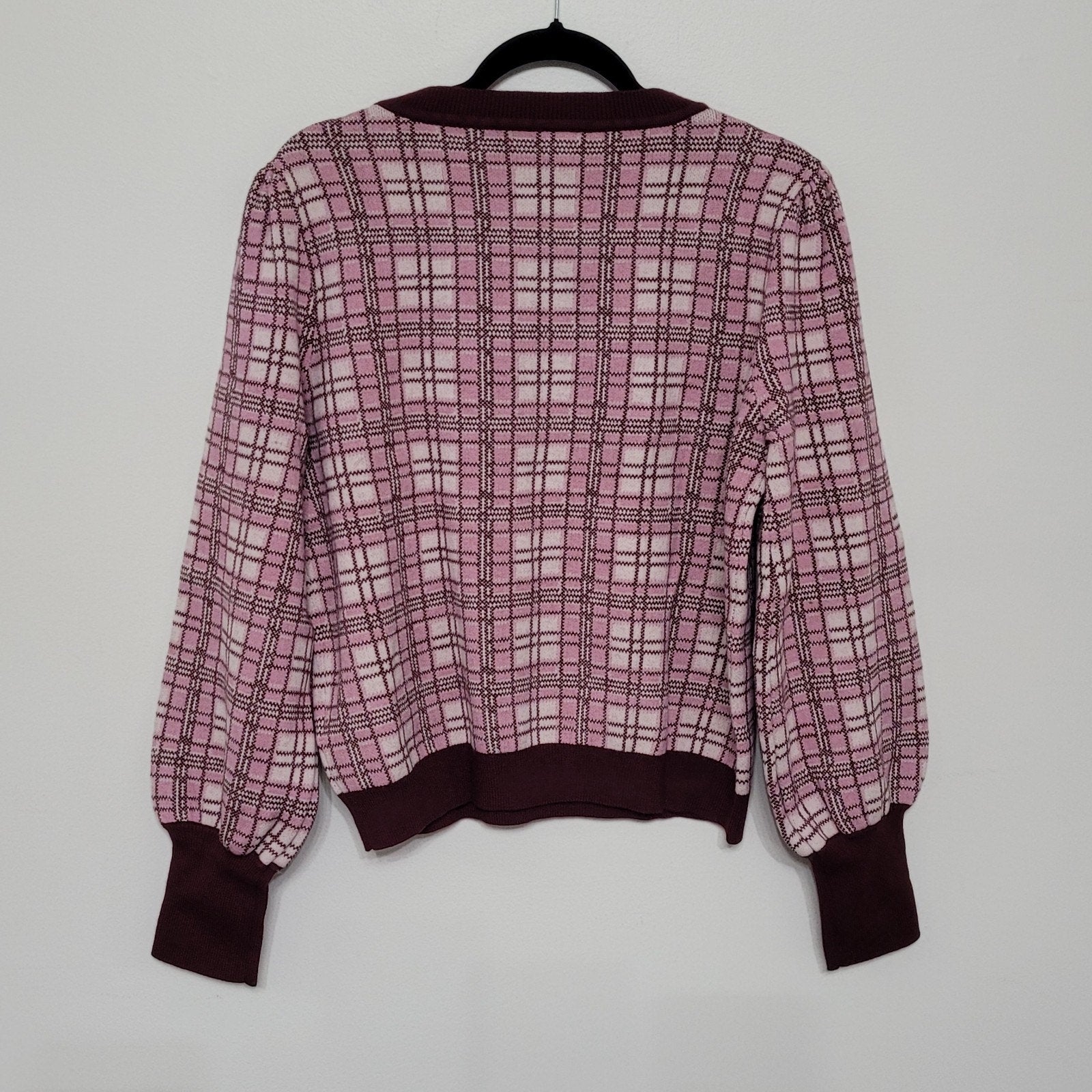 LuLaRoe women’s “Piper” balloon sleeve sweater, size Large, in burgundy plaid.
