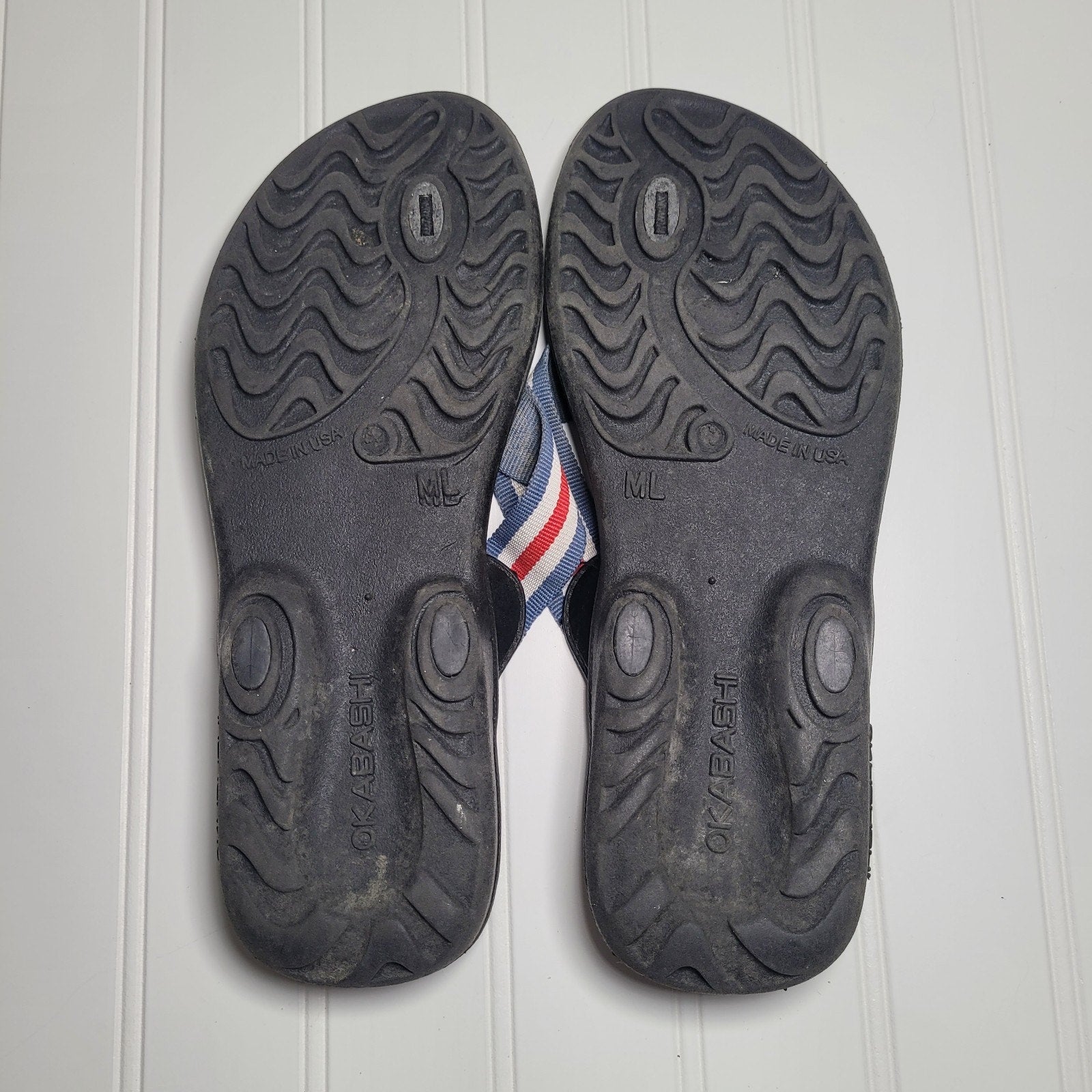 Okabashi comfort flip flop sandals in black with red, white, and blue webbed straps, women’s size M/L (fits approximately US 8–9).