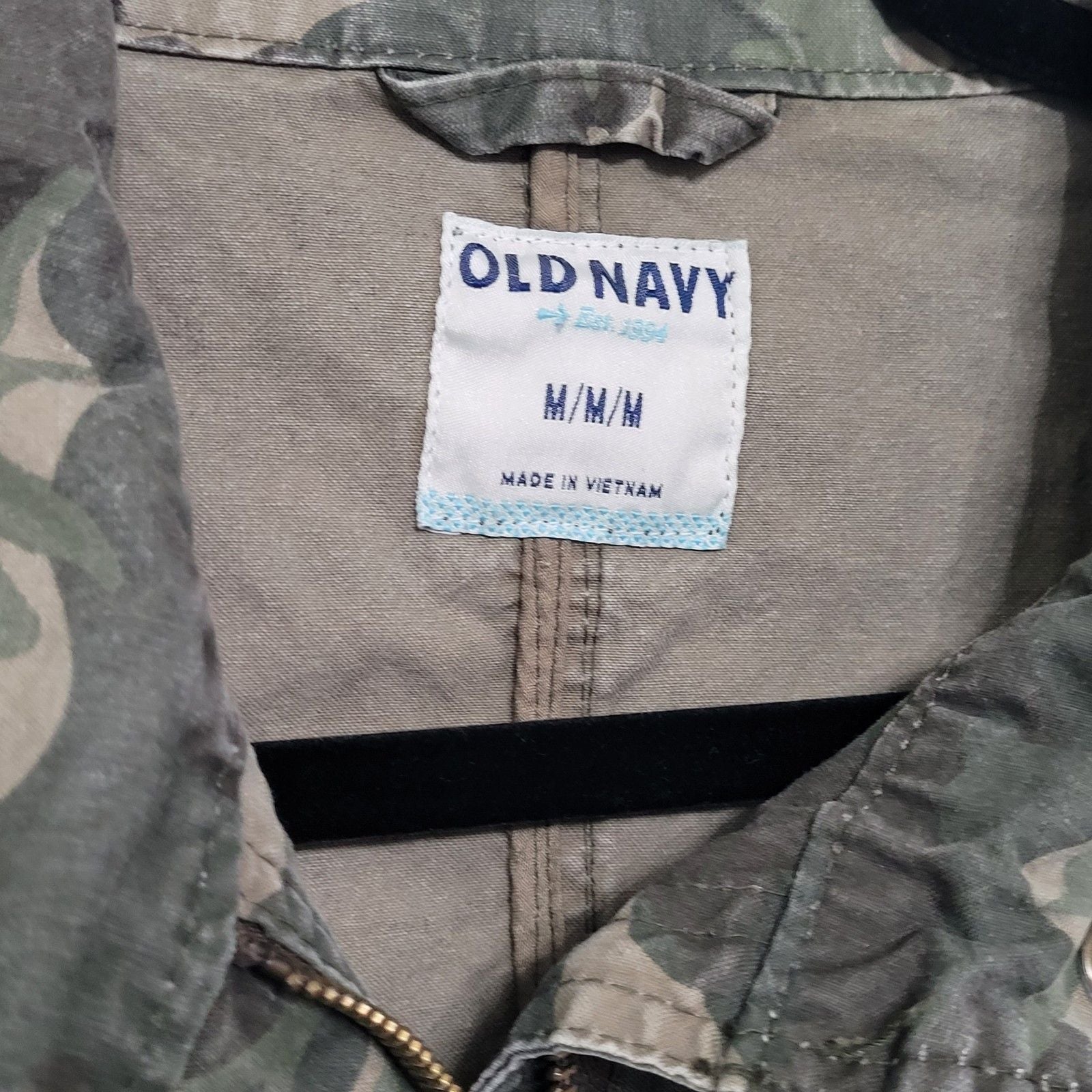 Old Navy women’s utility jacket, size Medium, in classic green camouflage with zip and button front.
