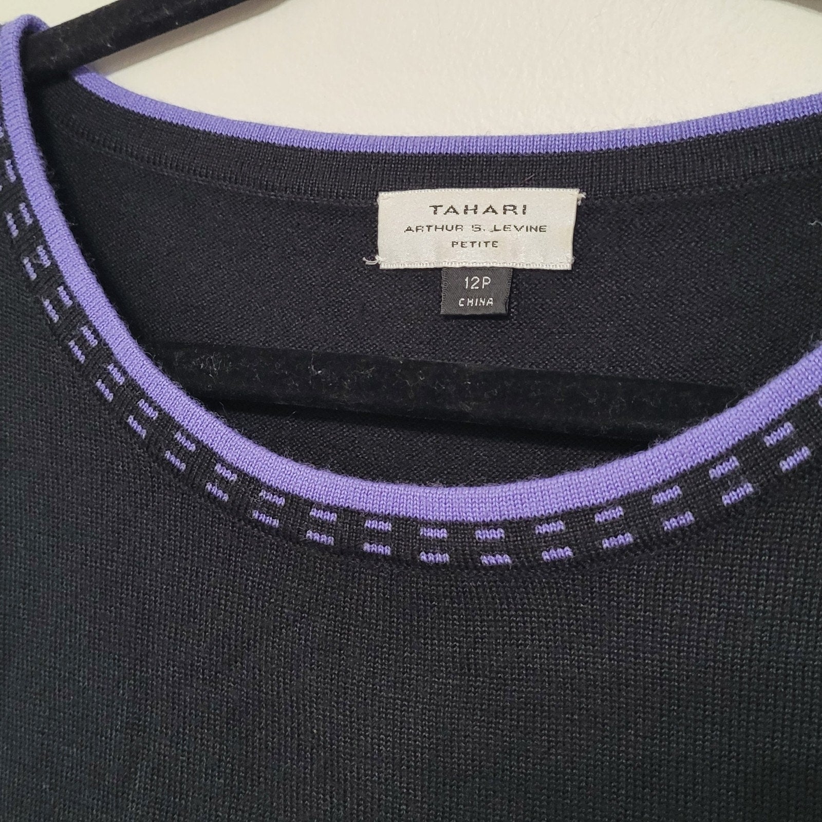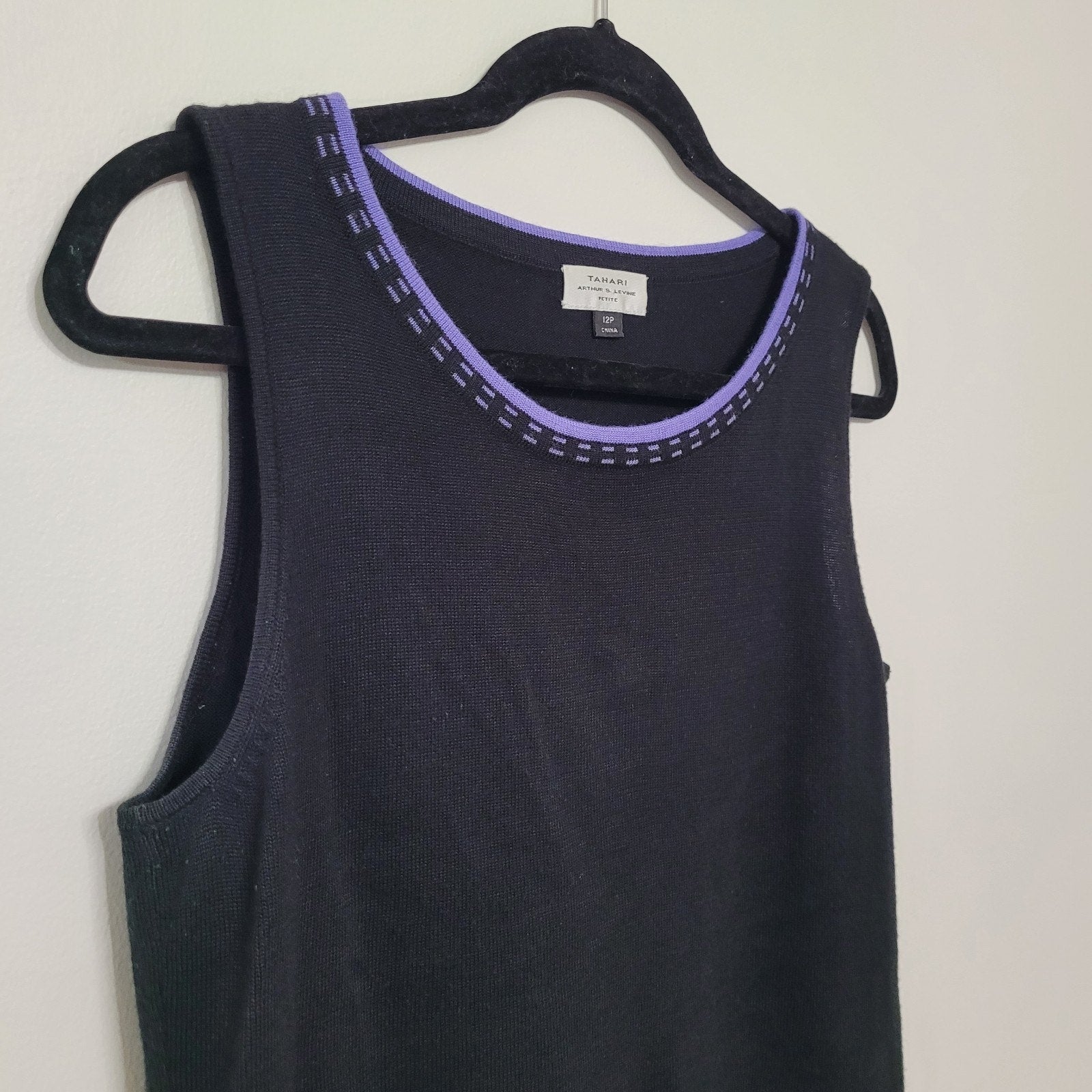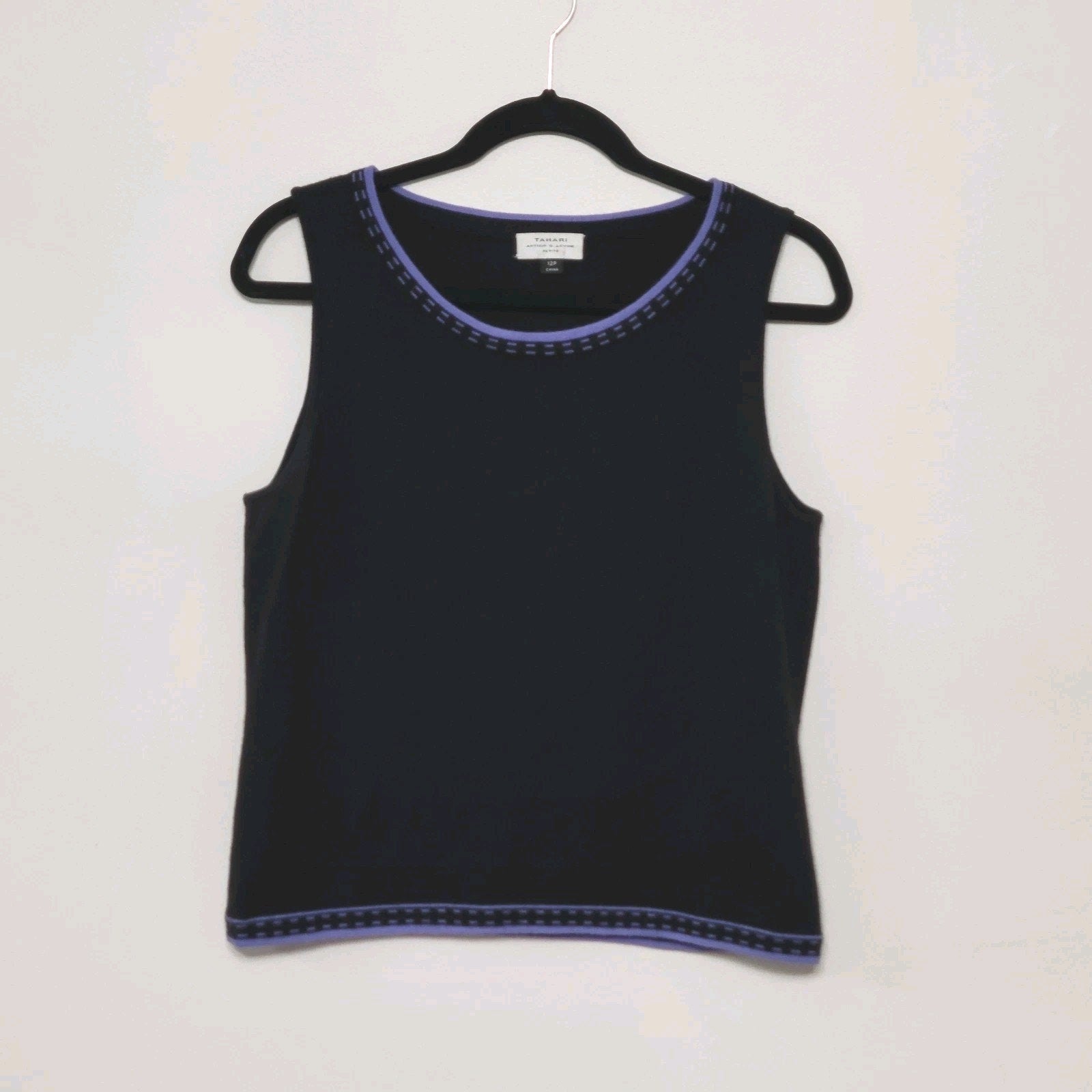 Tahari knit tank top in classic black with purple trim detail, size 10P. This sophisticated sleeveless blouse features the brand's signature professional styling and elegant contrast trim that's perfect for office wear or polished casual looks.
