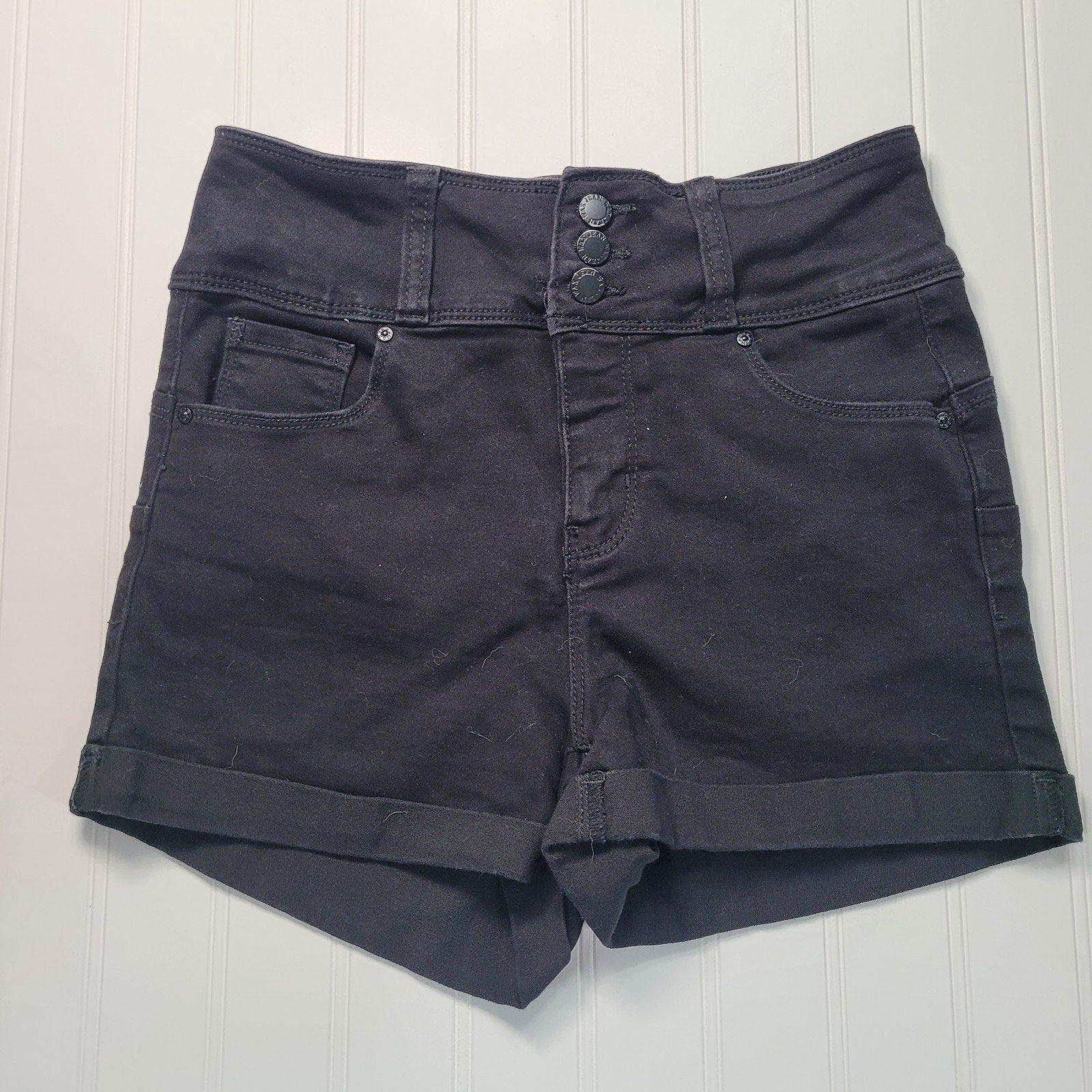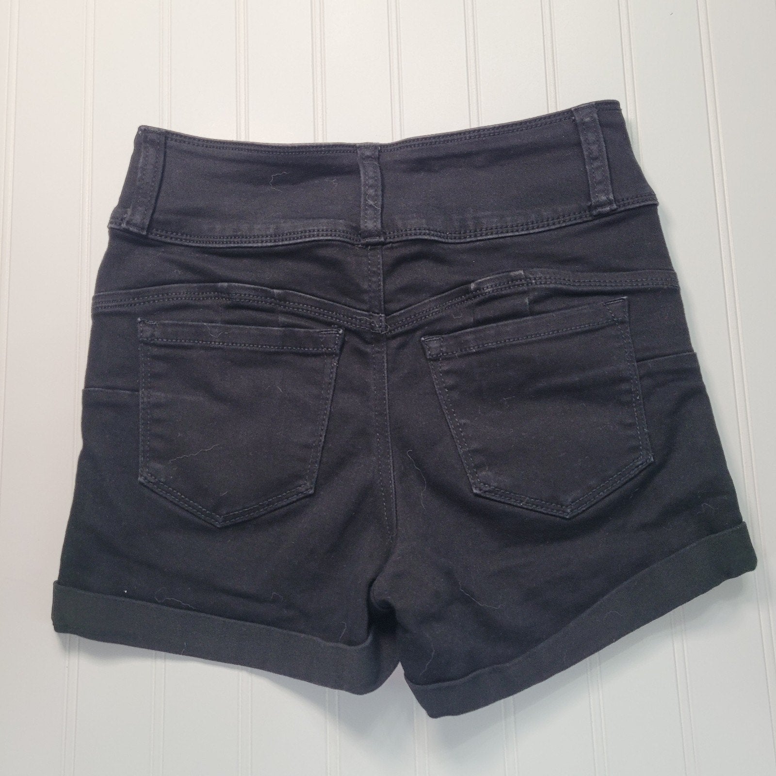Wax Jeans high-rise denim shorts in black, women’s/juniors size Small, featuring cuffed hems and triple-button front closure.